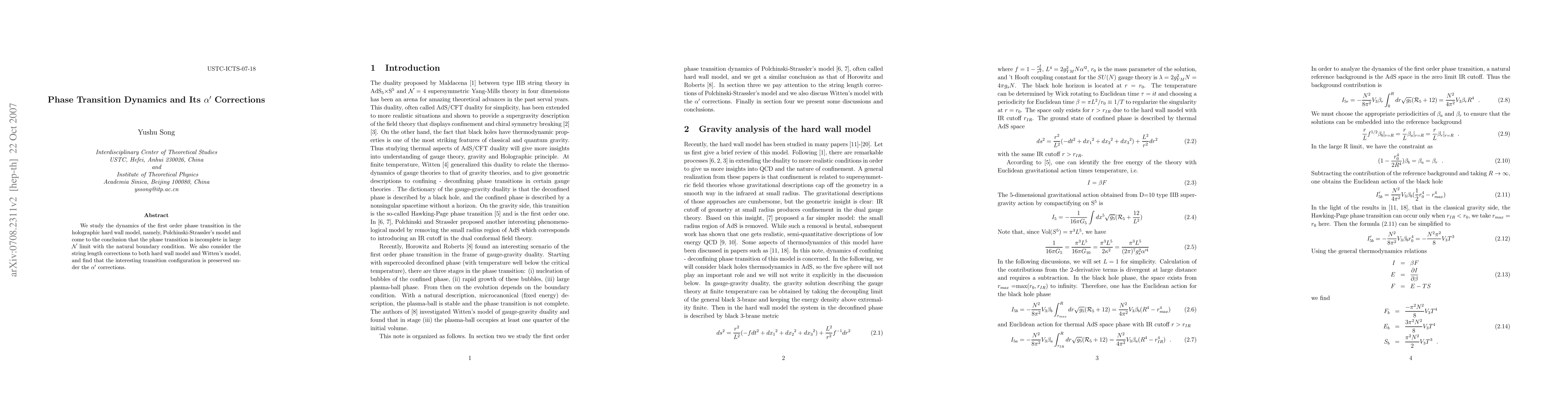 Researchers studied phase transition dynamics in holographic models, finding that a first-order transition is incomplete in large N limit with natural boundary conditions. Alpha' corrections preserve the interesting transition configuration in both hard wall model and Witten's model.