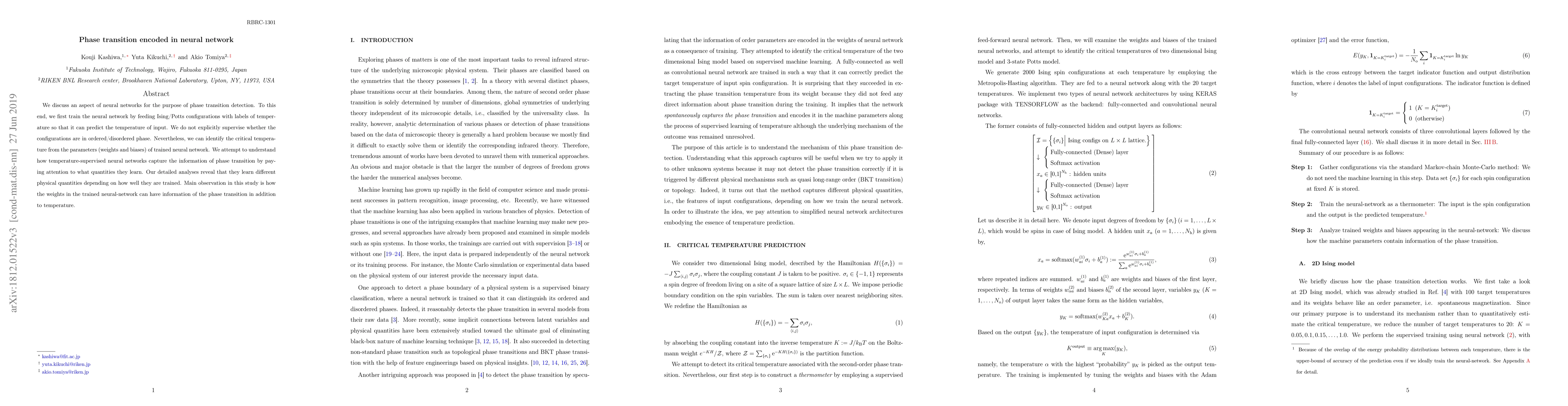 This research trains neural networks to predict temperature from Ising/Potts configurations, identifying the critical temperature from the network's parameters without explicit supervision on phase states. The study reveals that trained neural networks encode information about phase transitions in their weights, capturing different physical quantities based on their training level.