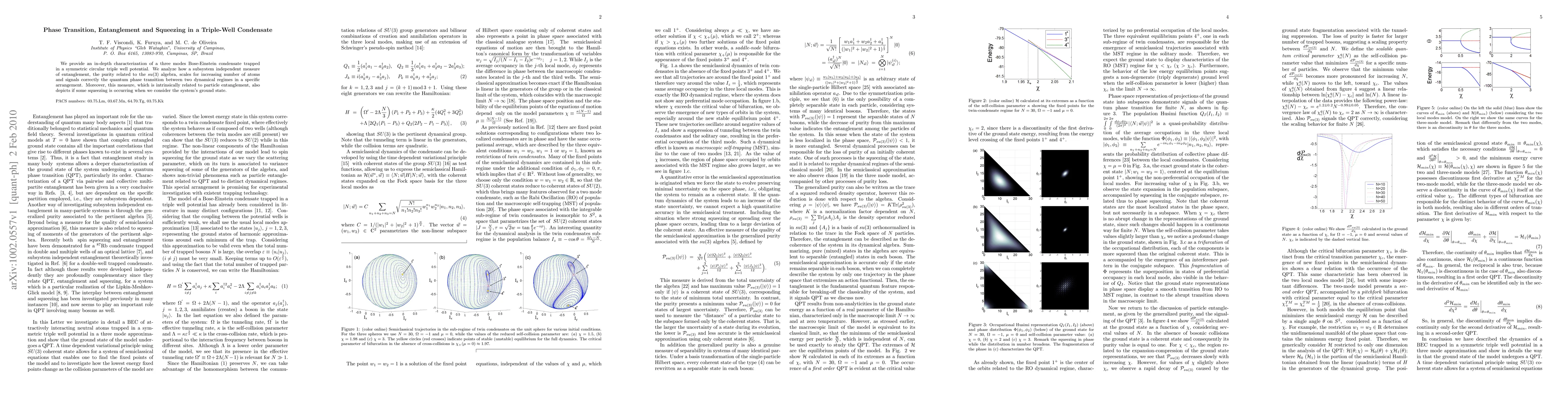 We provide an in-depth characterization of a three modes Bose-Einstein condensate trapped in a symmetric circular triple well potential. We analyze how a subsystem independent measure of entanglement, the purity related to the su(3) algebra, scales for increasing number of atoms and signals correctly the quantum phase transition between two dynamical regimes in a specific arrangement. Moreover, this measure, which is intrinsically related to particle entanglement, also depicts if some squeezing is occurring when we consider the system's ground state.