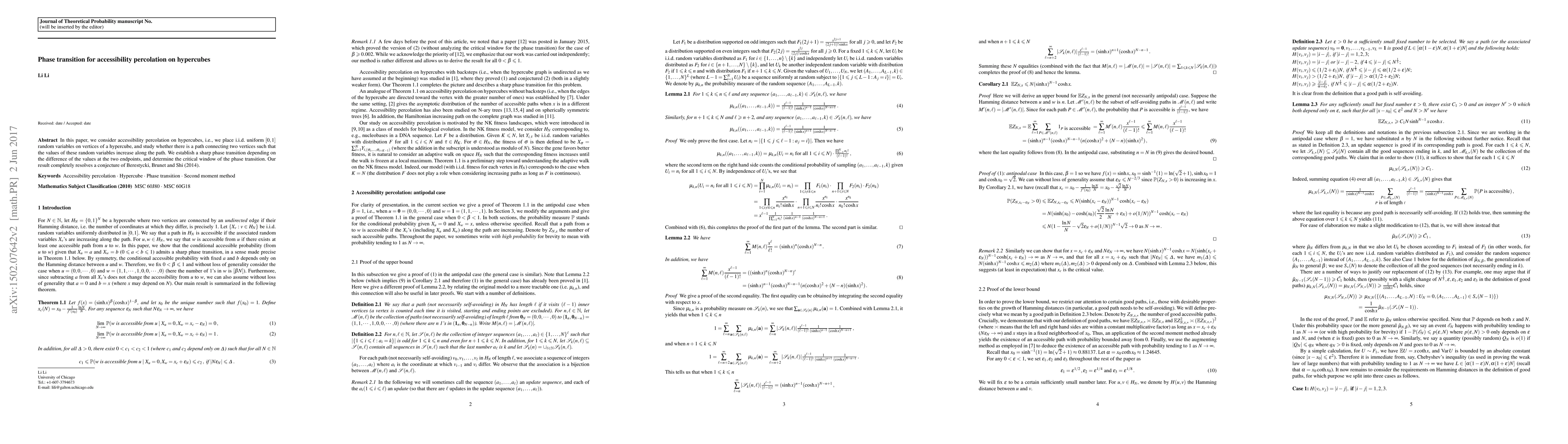 Researchers study accessibility percolation on hypercubes, finding a phase transition that resolves a conjecture, depending on the difference of values at two endpoints.
