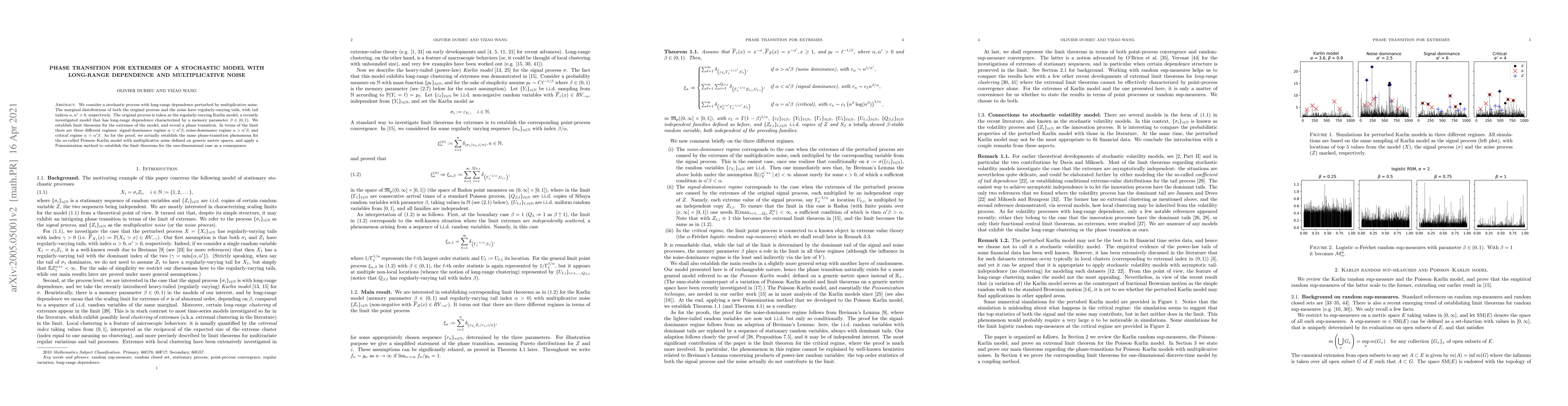 This paper investigates a stochastic process with long-range dependence and multiplicative noise, establishing limit theorems for its extremes. It reveals a phase transition with three regimes: signal-dominance, noise-dominance, and a critical regime, depending on the tail indices of the process and noise.