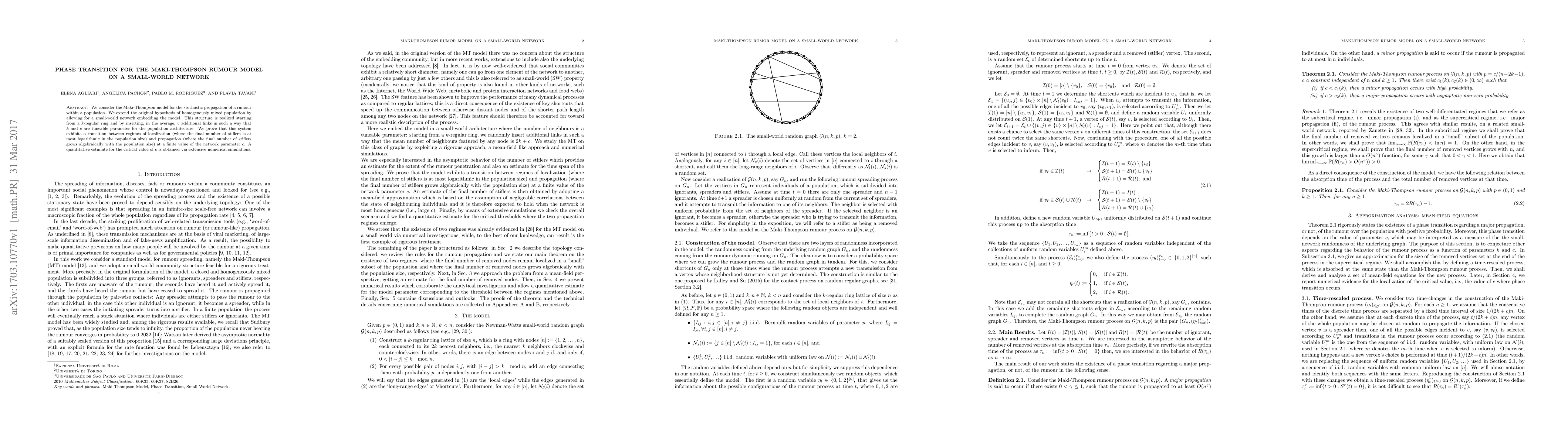A new model simulates how rumors spread in a population with a small-world network structure, showing a phase transition between localized and widespread propagation depending on the network's connection density.