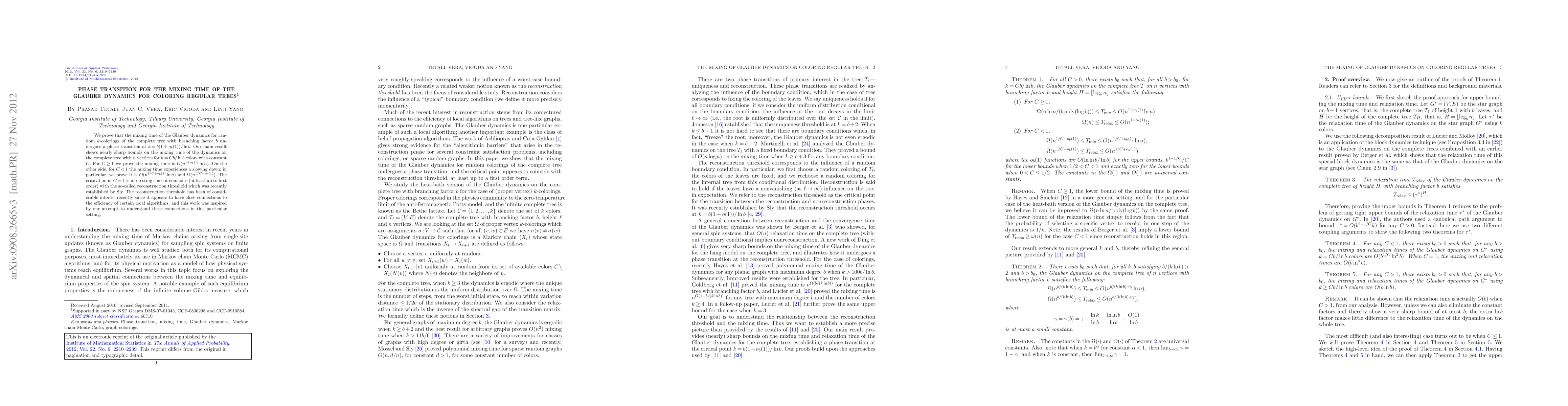 The Glauber dynamics for coloring regular trees undergoes a phase transition in mixing time at $k=b(1+o_b(1))/rac{b}{ar{n}}$ colors, where the mixing time is either nearly sharp bounds of $O(n^{1+o_b(1)}rac{ar{n}}{n})$ or slowing down to $ ext{ } O(n^{rac{1}{c} + o_{b}(1)}} ext{ } ext{or} ext{ } ext{$ ext{ } ext{o(n^{1/c - o_{b}(1)}}}$ colors with constants c=1 and C<c.