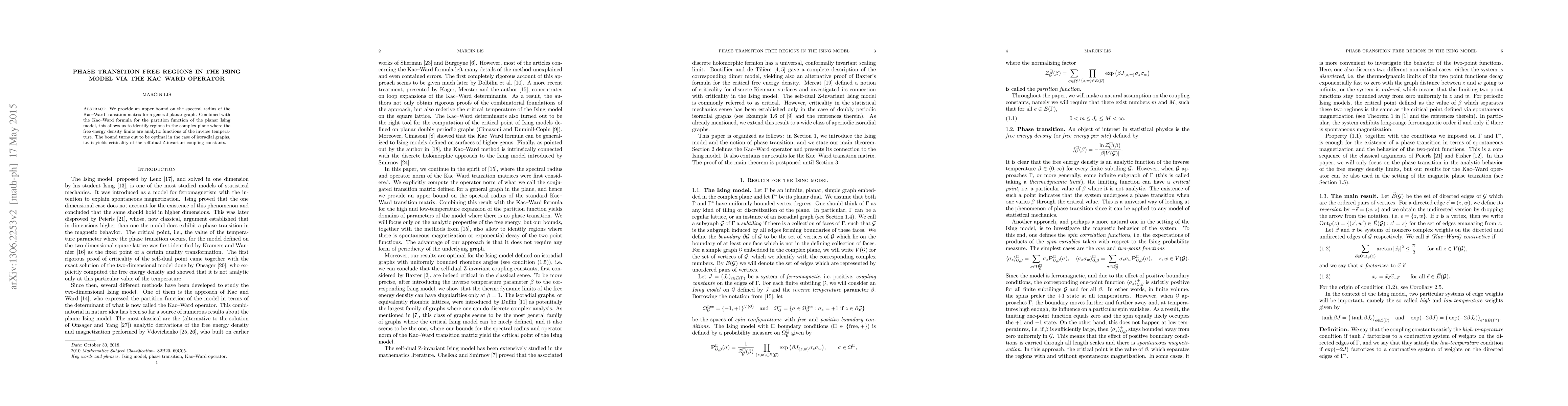 This paper examines the spectral properties of the Kac-Ward transition matrix for the Ising model on planar graphs, identifying regions in the complex plane where the free energy density is analytic. The results reveal optimal bounds for isoradial graphs, highlighting criticality at self-dual Z-invariant coupling constants.
