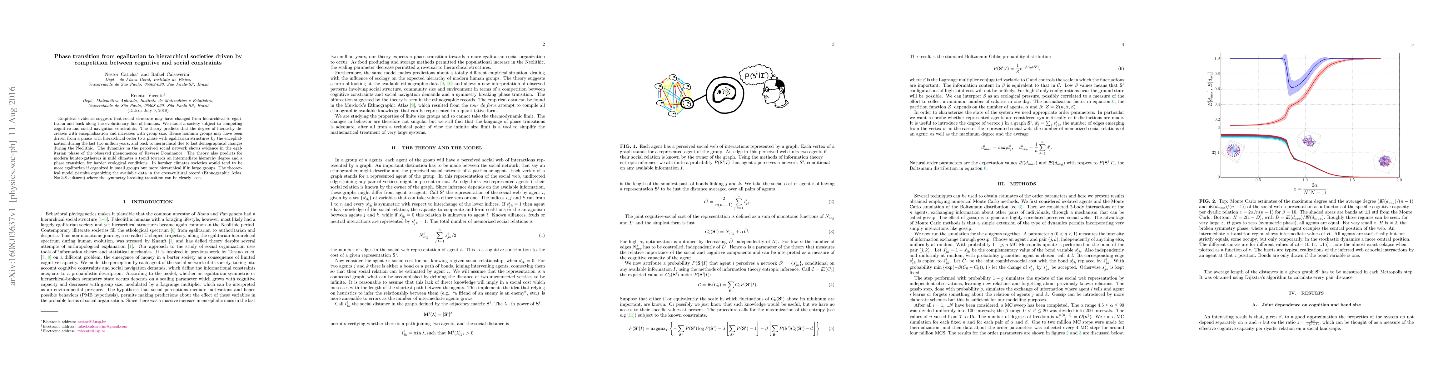 Empirical evidence suggests that social structure may have changed from hierarchical to egalitarian and back along the evolutionary line of humans. We model a society subject to competing cognitive and social navigation constraints. The theory predicts that the degree of hierarchy decreases with encephalization and increases with group size. Hence hominin groups may have been driven from a phase with hierarchical order to a phase with egalitarian structures by the encephalization during the last two million years, and back to hierarchical due to fast demographical changes during the Neolithic. The dynamics in the perceived social network shows evidence in the egalitarian phase of the observed phenomenon of Reverse Dominance. The theory also predicts for modern hunter-gatherers in mild climates a trend towards an intermediate hierarchy degree and a phase transition for harder ecological conditions. In harsher climates societies would tend to bemore egalitarian if organized in small groups but more hierarchical if in large groups. The theoretical model permits organizing the available data in the cross-cultural record (Ethnographic Atlas, N=248 cultures) where the symmetry breaking transition can be clearly seen.