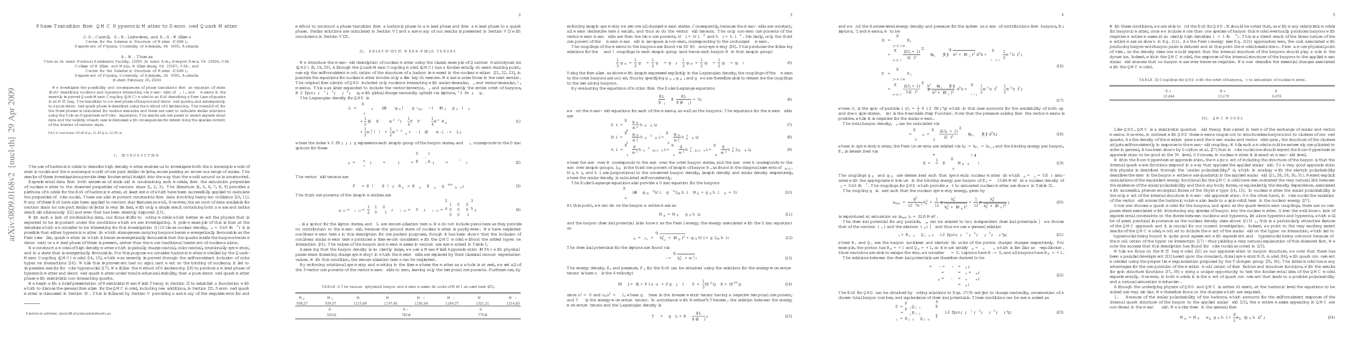 We investigate the possibility and consequences of phase transitions from an equation of state (EOS) describing nucleons and hyperons interacting via mean fields of sigma, omega, and rho mesons in the recently improved quark-meson coupling (QMC) model to an EOS describing a Fermi gas of quarks in an MIT bag. The transition to a mixed phase of baryons and deconfined quarks, and subsequently to a pure deconfined quark phase, is described using the method of Glendenning. The overall EOS for the three phases is calculated for various scenarios and used to calculate stellar solutions using the Tolman-Oppenheimer-Volkoff equations. The results are compared with recent experimental data, and the validity of each case is discussed with consequences for determining the species content of the interior of neutron stars.