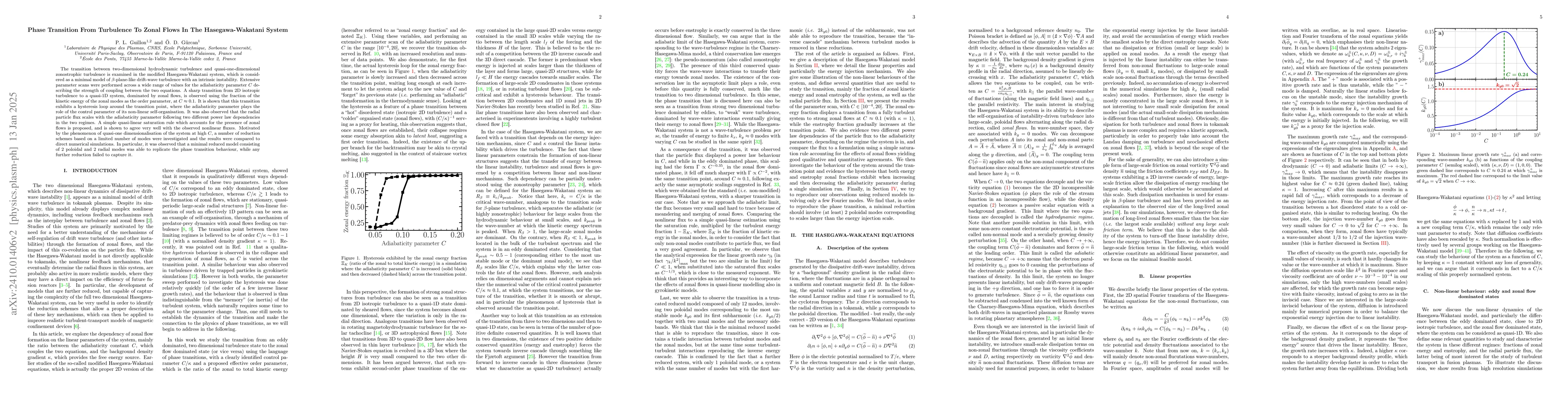 This study investigates the transition from two-dimensional turbulence to quasi-one-dimensional zonal flows in the Hasegawa-Wakatani system, finding a sharp transition at an adiabaticity parameter $C \approx 0.1$ with hysteresis. The radial particle flux shows different power law dependencies in each regime, and a minimal reduced model of 2 poloidal and 2 radial modes accurately replicates the phase transition.