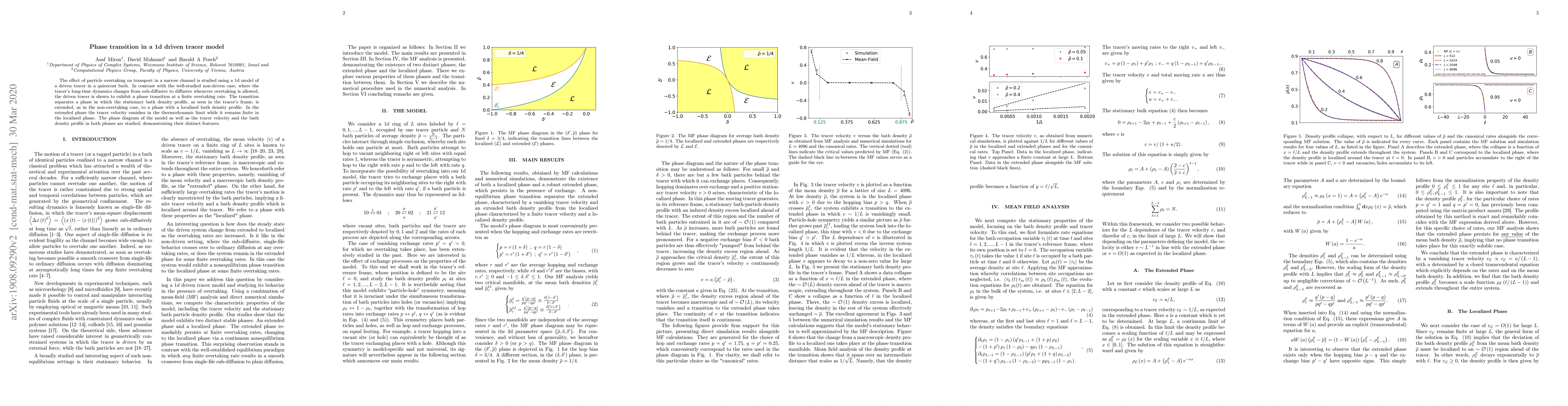 Researchers studied how a tracer moves through a narrow channel with a 'driven' fluid, finding that at a certain overtaking rate, the movement changes, resulting in two distinct phases: one with an extended bath density profile and another with a localized profile.