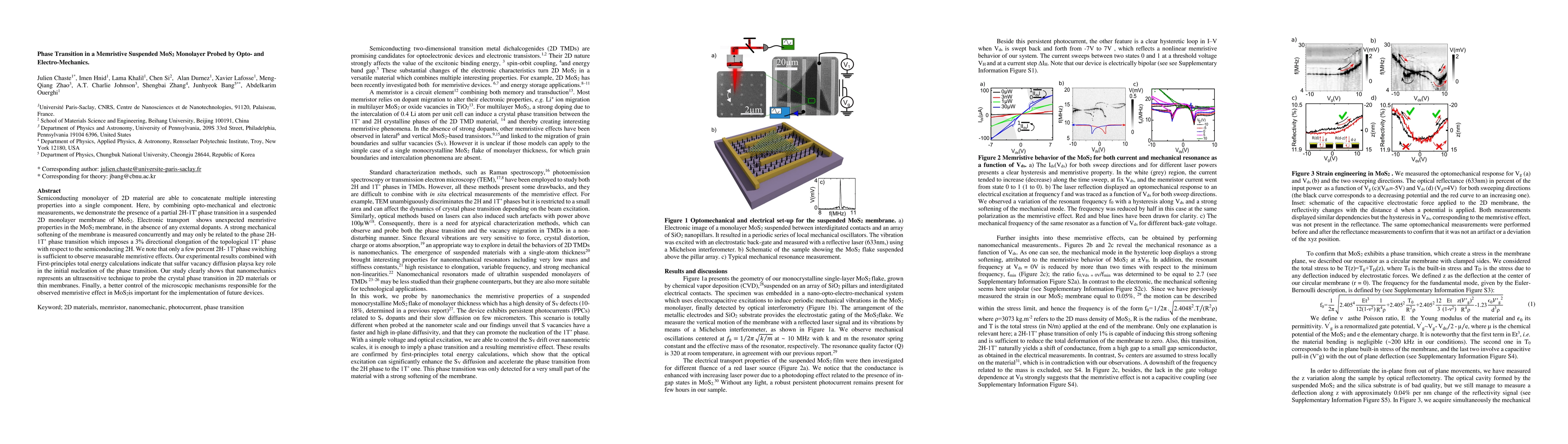 Semiconducting monolayer of 2D material are able to concatenate multiple interesting properties into a single component. Here, by combining opto-mechanical and electronic measurements, we demonstrate the presence of a partial 2H-1T phase transition in a suspended 2D monolayer membrane of MoS2. Electronic transport shows unexpected memristive properties in the MoS2 membrane, in the absence of any external dopants. A strong mechanical softening of the membrane is measured concurrently and may only be related to the phase 2H-1T phase transition which imposes a 3percent directional elongation of the topological 1T phase with respect to the semiconducting 2H. We note that only a few percent 2H- 1T phase switching is sufficient to observe measurable memristive effects. Our experimental results combined with First-principles total energy calculations indicate that sulfur vacancy diffusion plays a key role in the initial nucleation of the phase transition. Our study clearly shows that nanomechanics represents an ultrasensitive technique to probe the crystal phase transition in 2D materials or thin membranes. Finally, a better control of the microscopic mechanisms responsible for the observed memristive effect in MoS2 is important for the implementation of future devices.