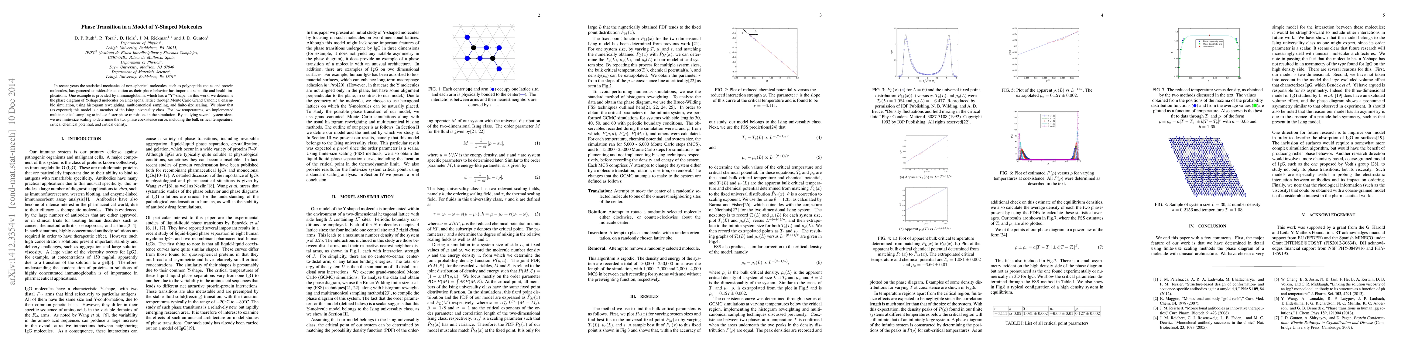 In recent years the statistical mechanics of non-spherical molecules, such as polypeptide chains and protein molecules, has garnered considerable attention as their phase behavior has important scientific and health implications. One example is provided by immunoglobulin, which has a "Y"-shape. In this work, we determine the phase diagram of Y-shaped molecules on a hexagonal lattice through Monte Carlo Grand Canonical ensemble simulation, using histogram reweighting, multicanonical sampling, and finite-size scaling. We show that (as expected) this model is a member of the Ising universality class. For low temperatures, we implemented multicanonical sampling to induce faster phase transitions in the simulation. By studying several system sizes, we use finite-size scaling to determine the two phase coexistence curve, including the bulk critical temperature, critical chemical potential, and critical density.