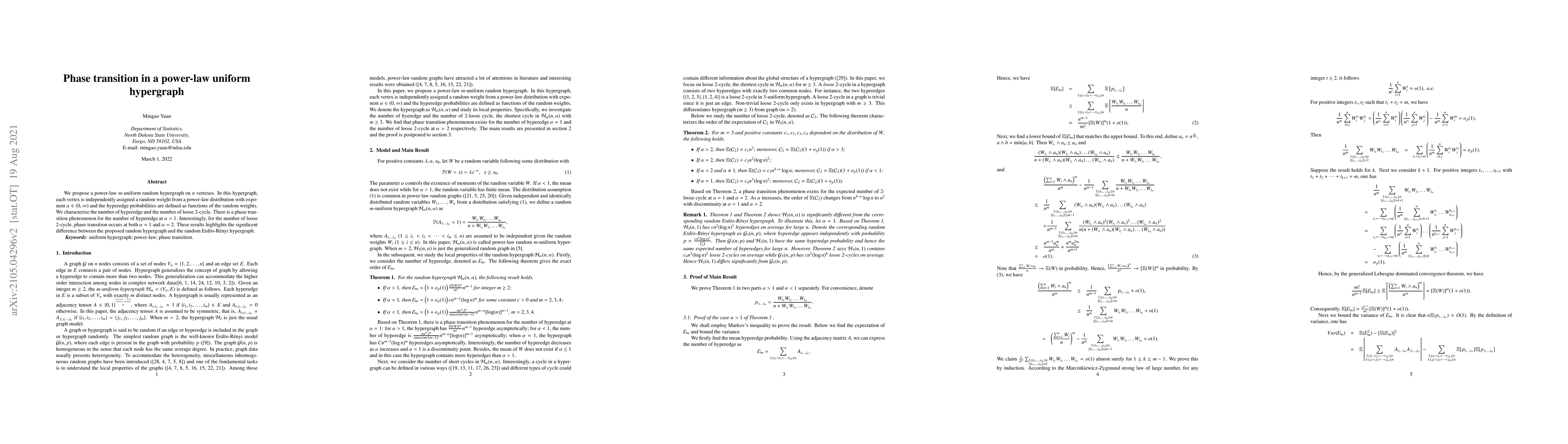 We propose a power-law $m$-uniform random hypergraph on $n$ vertexes. In this hypergraph, each vertex is independently assigned a random weight from a power-law distribution with exponent $\alpha\in(0,\infty)$ and the hyperedge probabilities are defined as functions of the random weights. We characterize the number of hyperedge and the number of loose 2-cycle. There is a phase transition phenomenon for the number of hyperedge at $\alpha=1$. Interestingly, for the number of loose 2-cycle, phase transition occurs at both $\alpha=1$ and $\alpha=2$.