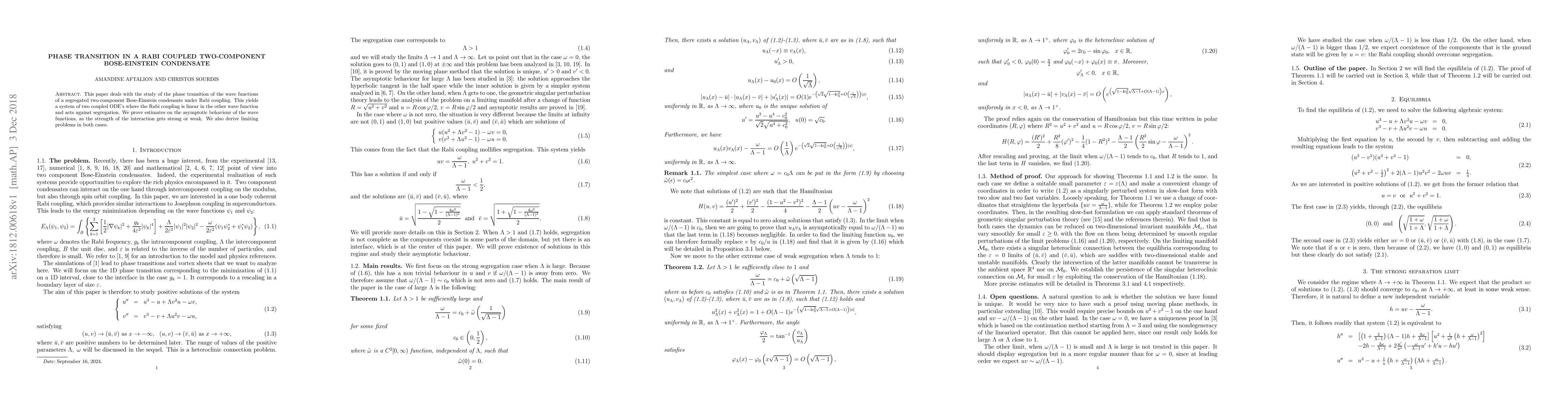 This paper investigates the phase transition in a Rabi coupled two-component Bose-Einstein condensate, deriving coupled ODEs and proving estimates on the wave functions' asymptotic behavior under varying interaction strengths. It also explores limiting problems for both strong and weak interactions.