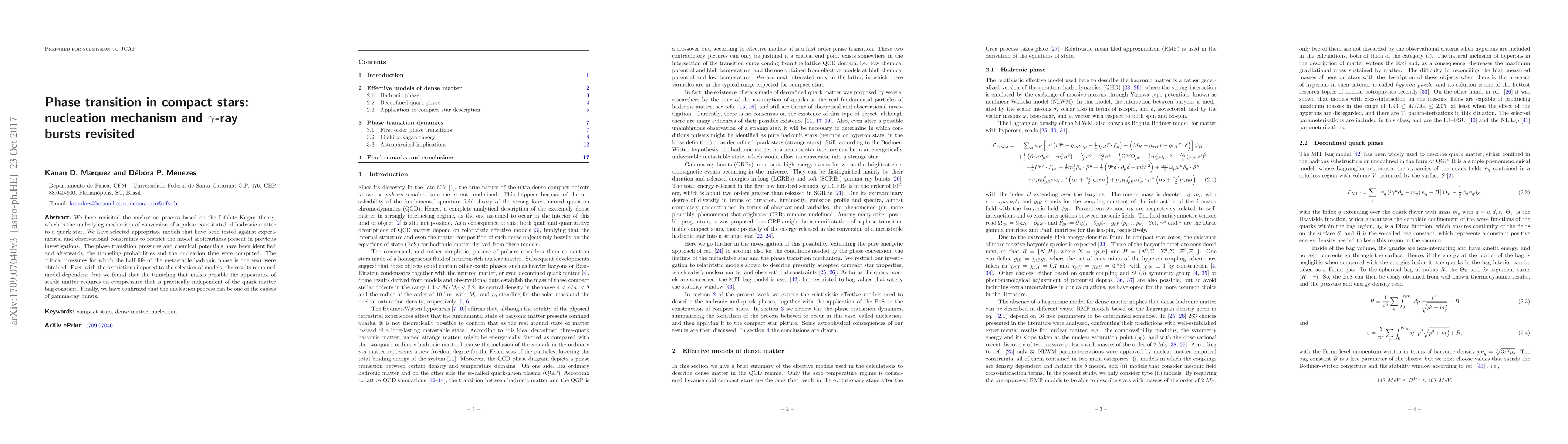This paper revisits the nucleation mechanism for the conversion of pulsars to quark stars using the Lifshitz-Kagan theory, identifying critical pressures and computing tunneling probabilities. It confirms that the nucleation process can cause gamma-ray bursts, despite model dependencies.