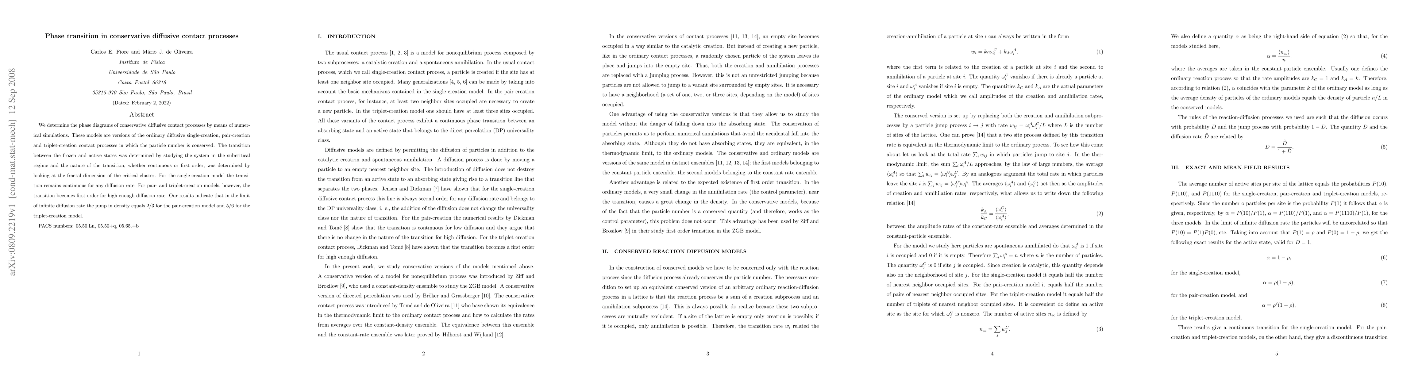 We determine the phase diagrams of conservative diffusive contact processes by means of numerical simulations. These models are versions of the ordinary diffusive single-creation, pair-creation and triplet-creation contact processes in which the particle number is conserved. The transition between the frozen and active states was determined by studying the system in the subcritical regime and the nature of the transition, whether continuous or first order, was determined by looking at the fractal dimension of the critical cluster. For the single-creation model the transition remains continuous for any diffusion rate. For pair- and triplet-creation models, however, the transition becomes first order for high enough diffusion rate. Our results indicate that in the limit of infinite diffusion rate the jump in density equals 2/3 for the pair-creation model and 5/6 for the triplet-creation model.
