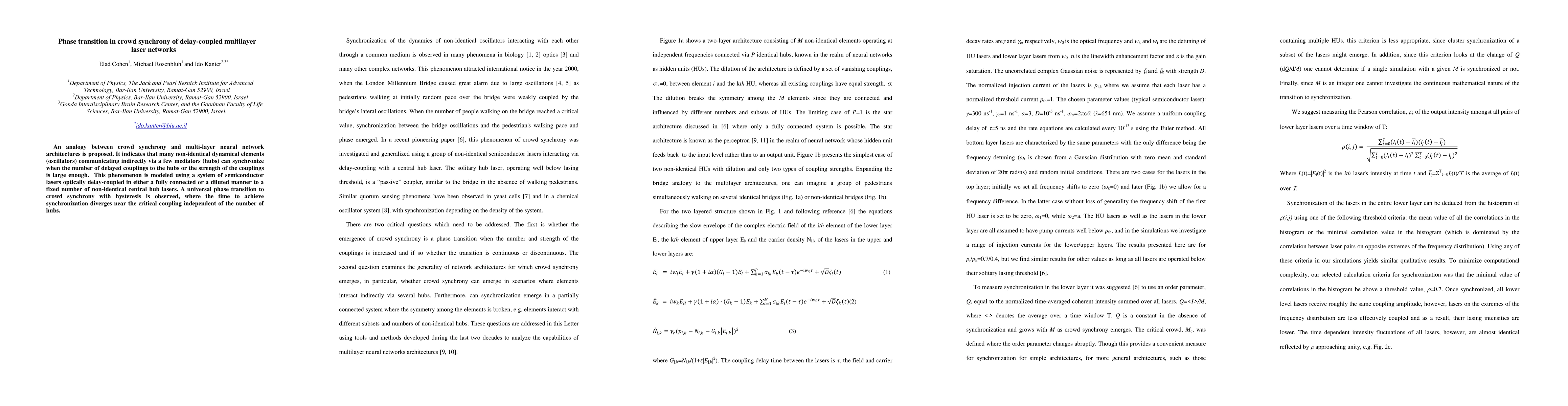 An analogy between crowd synchrony and multi-layer neural network architectures is proposed. It indicates that many non-identical dynamical elements (oscillators) communicating indirectly via a few mediators (hubs) can synchronize when the number of delayed couplings to the hubs or the strength of the couplings is large enough. This phenomenon is modeled using a system of semiconductor lasers optically delay-coupled in either a fully connected or a diluted manner to a fixed number of non-identical central hub lasers. A universal phase transition to crowd synchrony with hysteresis is observed, where the time to achieve synchronization diverges near the critical coupling independent of the number of hubs.