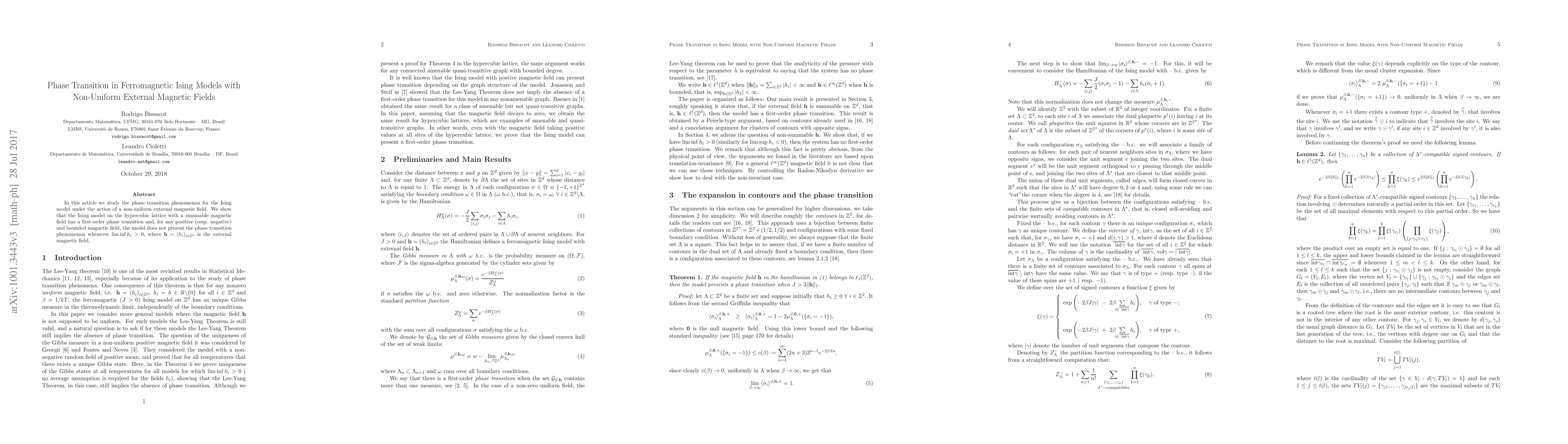 This paper investigates the phase transition in the Ising model under non-uniform external magnetic fields, demonstrating a first-order transition for summable fields, while no phase transition occurs for positive or negative bounded fields when the minimum limit of the field is greater than zero.