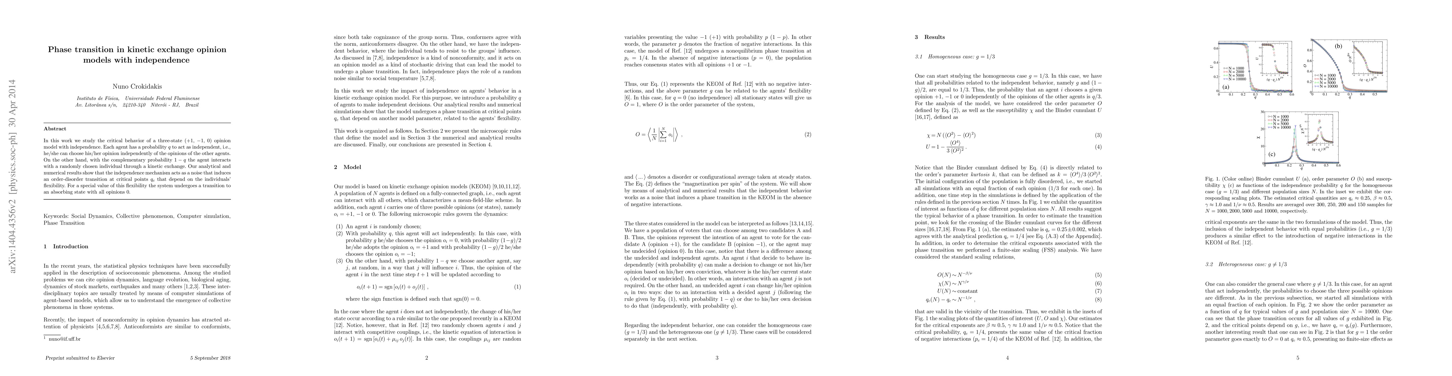 This paper investigates a three-state opinion model where agents can either act independently or interact through kinetic exchange, with a critical transition occurring at a probability threshold $q_{c}$. The independence mechanism introduces noise, leading to an order-disorder transition dependent on individual flexibility, culminating in an absorbing state where all opinions converge to zero.