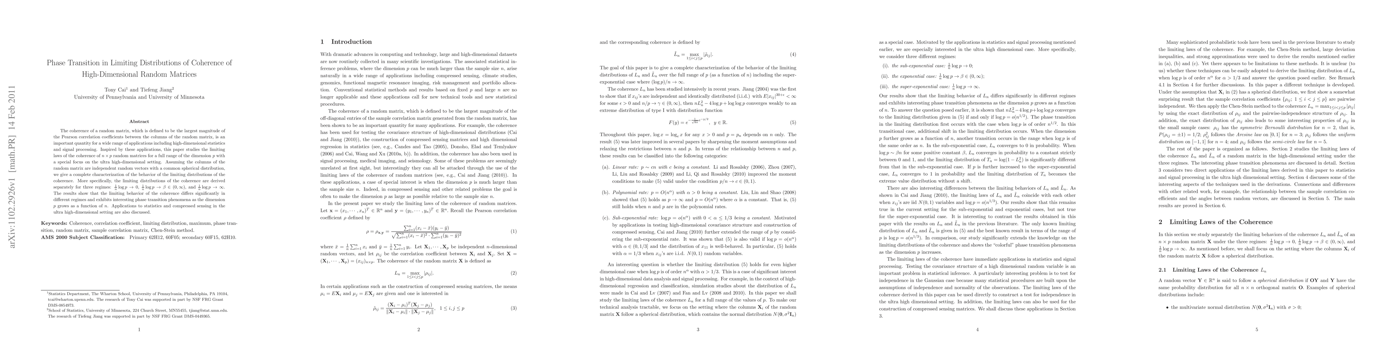 This paper investigates the limiting distributions of the coherence of high-dimensional random matrices, revealing distinct behaviors and phase transition phenomena across different regimes of the ratio of dimensions $p$ to $n$. The findings have implications for high-dimensional statistics and signal processing, particularly in ultra high-dimensional settings.
