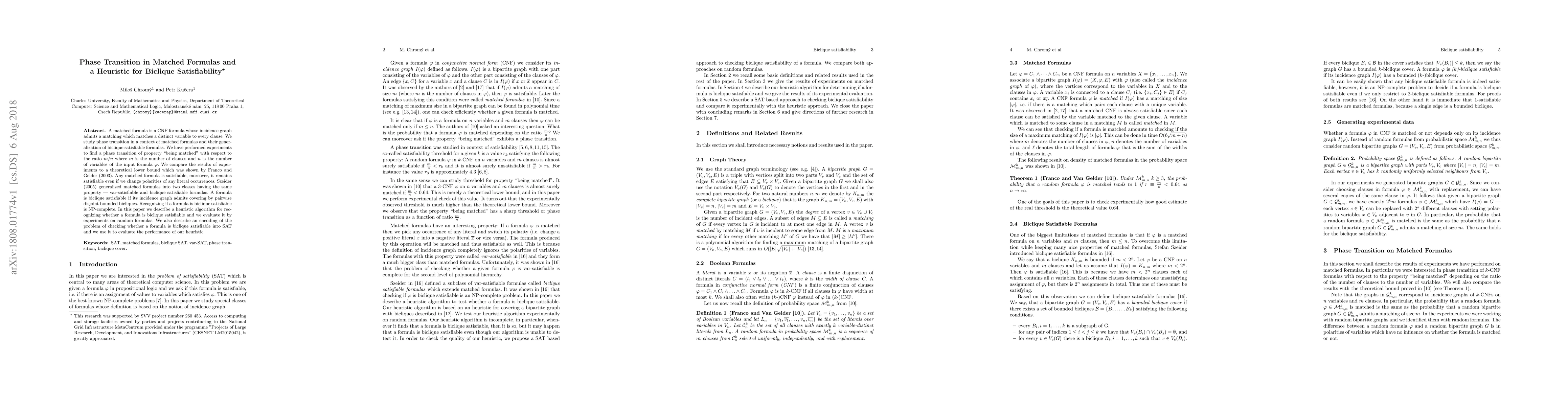 This paper investigates the phase transition in matched formulas and their generalization, biclique satisfiable formulas, focusing on the ratio of clauses to variables. It proposes a heuristic algorithm for recognizing biclique satisfiability and evaluates its performance through experiments on random formulas, comparing it to a theoretical lower bound.