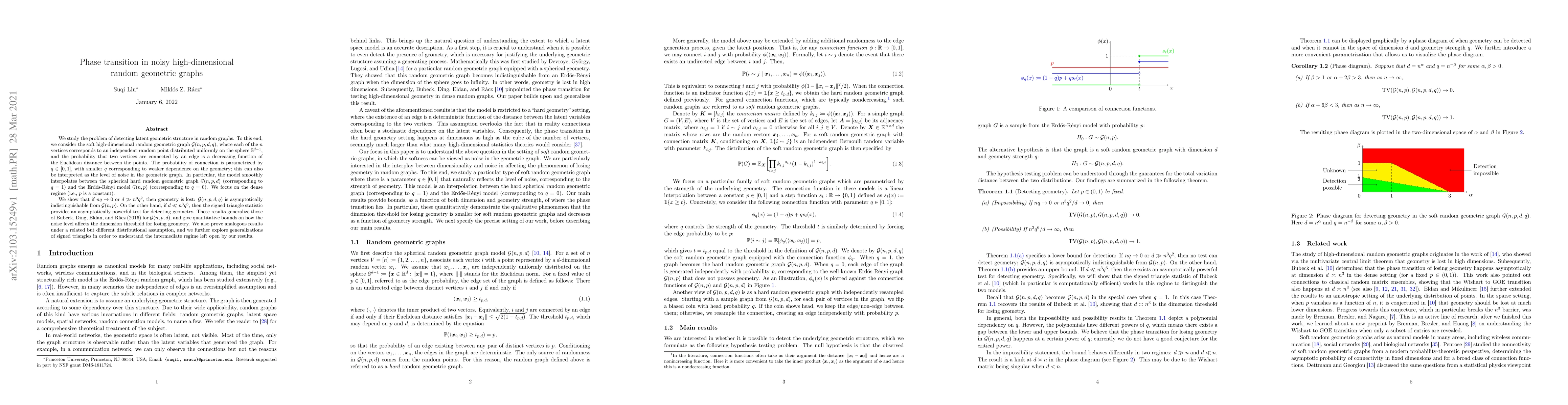 We study the problem of detecting latent geometric structure in random graphs. To this end, we consider the soft high-dimensional random geometric graph $\mathcal{G}(n,p,d,q)$, where each of the $n$ vertices corresponds to an independent random point distributed uniformly on the sphere $\mathbb{S}^{d-1}$, and the probability that two vertices are connected by an edge is a decreasing function of the Euclidean distance between the points. The probability of connection is parametrized by $q \in [0,1]$, with smaller $q$ corresponding to weaker dependence on the geometry; this can also be interpreted as the level of noise in the geometric graph. In particular, the model smoothly interpolates between the spherical hard random geometric graph $\mathcal{G}(n,p,d)$ (corresponding to $q = 1$) and the Erd\H{o}s-R\'enyi model $\mathcal{G}(n,p)$ (corresponding to $q = 0$). We focus on the dense regime (i.e., $p$ is a constant). We show that if $nq \to 0$ or $d \gg n^{3} q^{2}$, then geometry is lost: $\mathcal{G}(n,p,d,q)$ is asymptotically indistinguishable from $\mathcal{G}(n,p)$. On the other hand, if $d \ll n^{3} q^{6}$, then the signed triangle statistic provides an asymptotically powerful test for detecting geometry. These results generalize those of Bubeck, Ding, Eldan, and R\'acz (2016) for $\mathcal{G}(n,p,d)$, and give quantitative bounds on how the noise level affects the dimension threshold for losing geometry. We also prove analogous results under a related but different distributional assumption, and we further explore generalizations of signed triangles in order to understand the intermediate regime left open by our results.