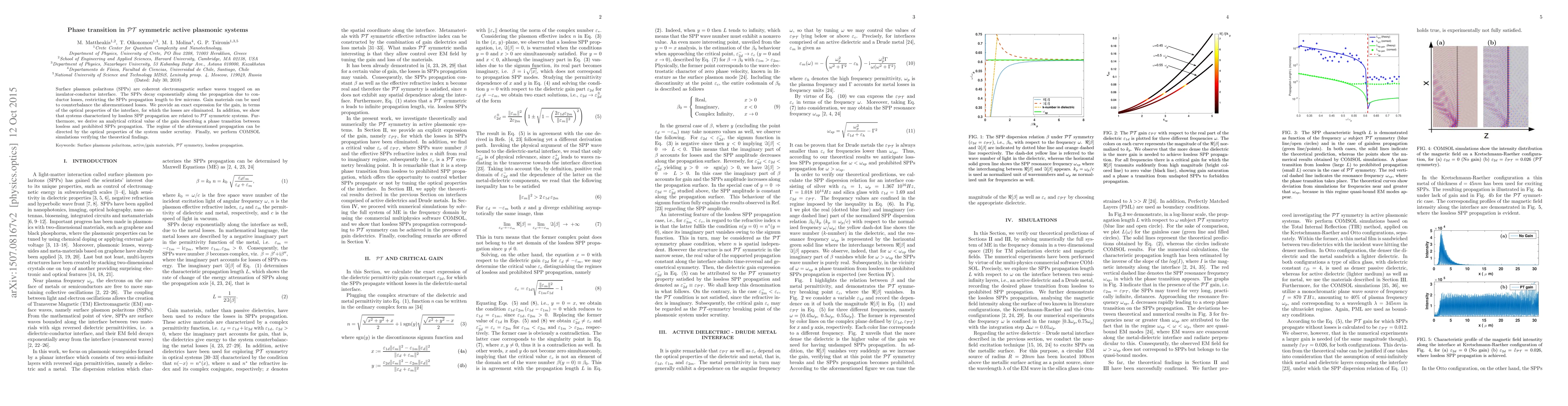 This paper explores phase transitions in PT symmetric active plasmonic systems, providing an exact expression for gain that eliminates conductor losses, and deriving a critical value for a phase transition between lossless and prohibited surface plasmon polaritons (SPP) propagation, supported by COMSOL simulations.