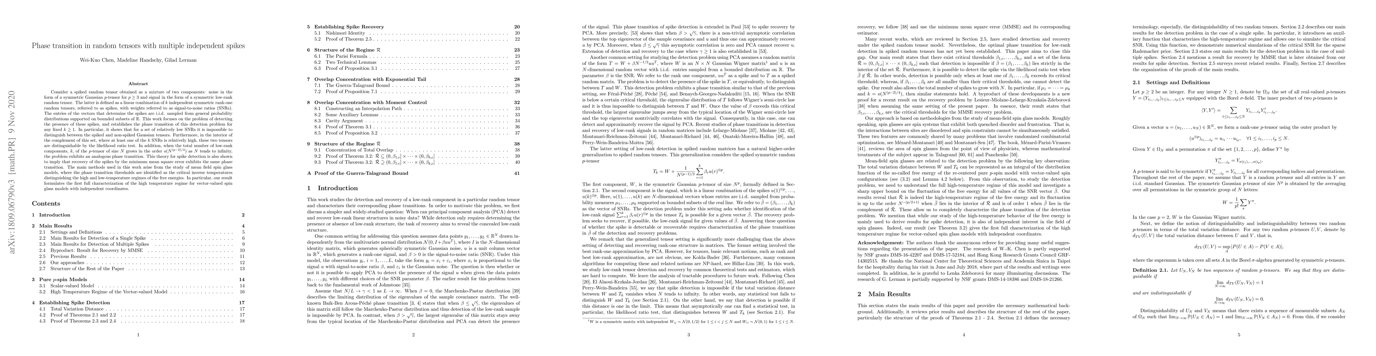 Researchers investigated the detection of spikes in a random tensor, finding that at low signal-to-noise ratios it's impossible to distinguish between spiked and non-spiked tensors, but as SNRs increase, they can be distinguished through likelihood ratio tests. The findings imply a phase transition in spike detection with similar characteristics to spin glass models.