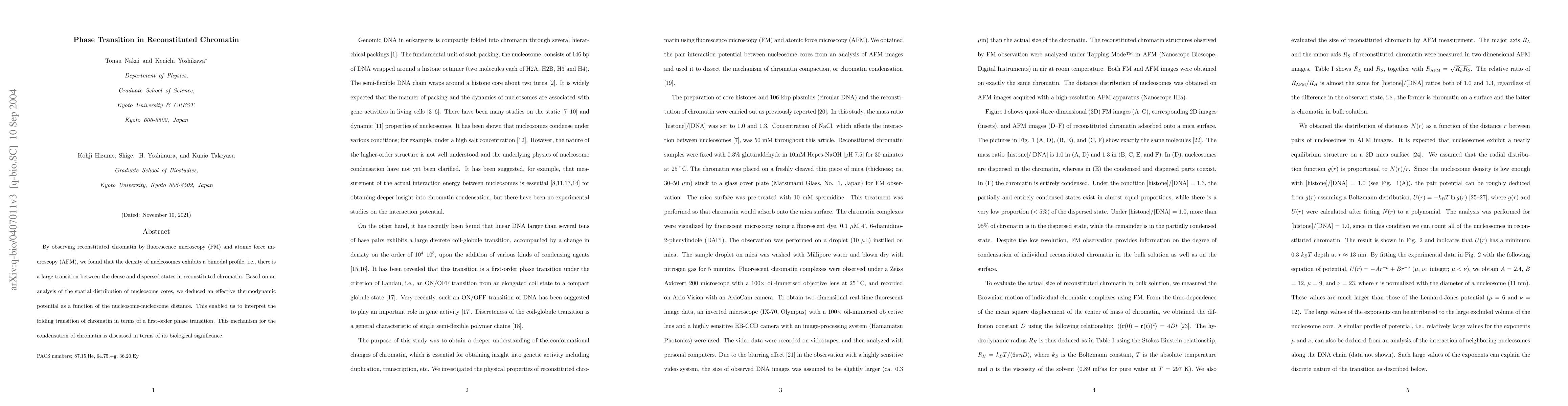 By observing reconstituted chromatin by fluorescence microscopy (FM) and atomic force microscopy (AFM), we found that the density of nucleosomes exhibits a bimodal profile, i.e., there is a large transition between the dense and dispersed states in reconstituted chromatin. Based on an analysis of the spatial distribution of nucleosome cores, we deduced an effective thermodynamic potential as a function of the nucleosome-nucleosome distance. This enabled us to interpret the folding transition of chromatin in terms of a first-order phase transition. This mechanism for the condensation of chromatin is discussed in terms of its biological significance.
