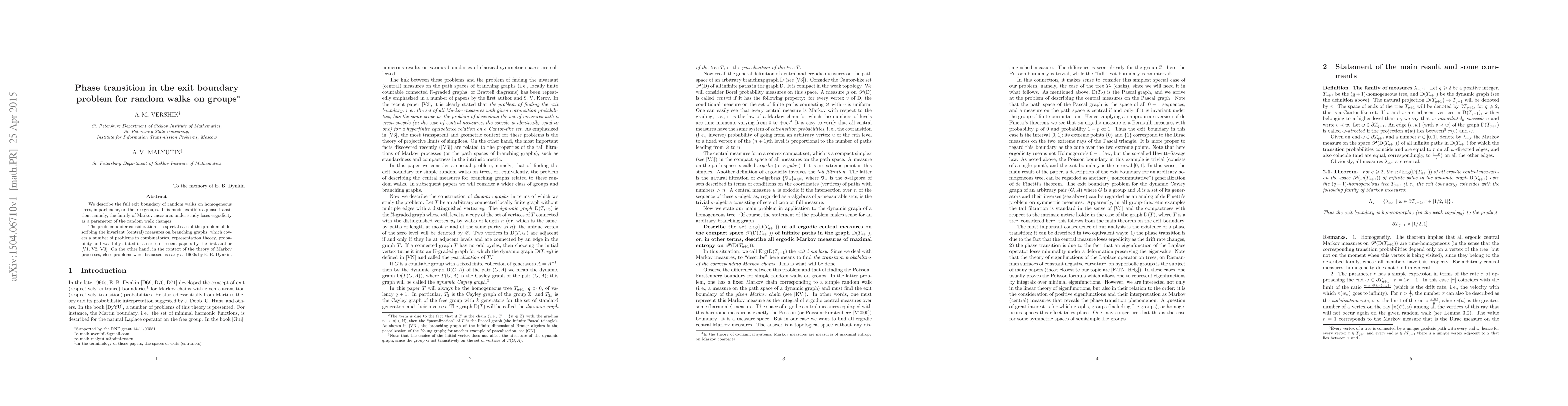 We describe the full exit boundary of random walks on homogeneous trees, in particular, on the free groups. This model exhibits a phase transition, namely, the family of Markov measures under study loses ergodicity as a parameter of the random walk changes. The problem under consideration is a special case of the problem of describing the invariant (central) measures on branching graphs, which covers a number of problems in combinatorics, representation theory, probability and was fully stated in a series of recent papers by the first author \cite{V1,V2,V3}. On the other hand, in the context of the theory of Markov processes, close problems were discussed as early as 1960s by E.~B.~Dynkin.