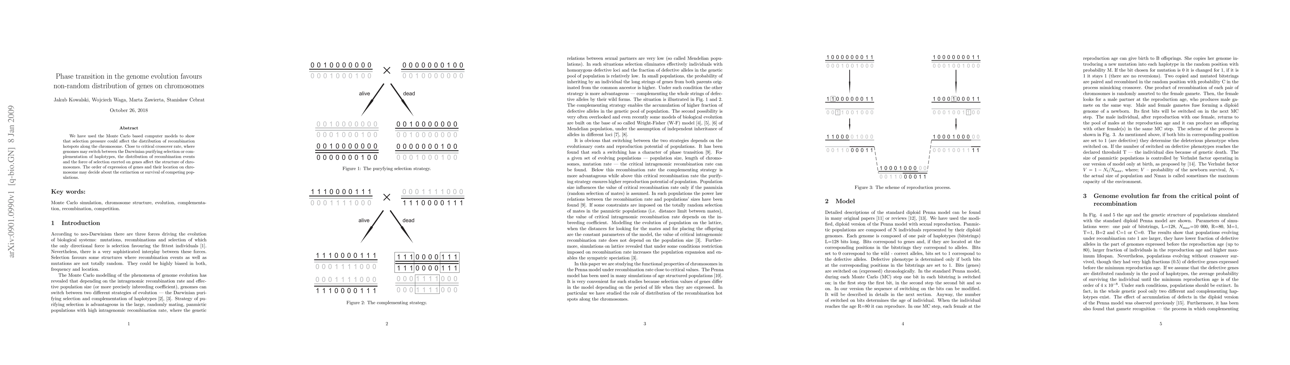 We have used the Monte Carlo based computer models to show that selection pressure could affect the distribution of recombination hotspots along the chromosome. Close to critical crossover rate, where genomes may switch between the Darwinian purifying selection or complementation of haplotypes, the distribution of recombination events and the force of selection exerted on genes affect the structure of chromosomes. The order of expression of gene s and their location on chromosome may decide about the extinction or survival of competing populations.