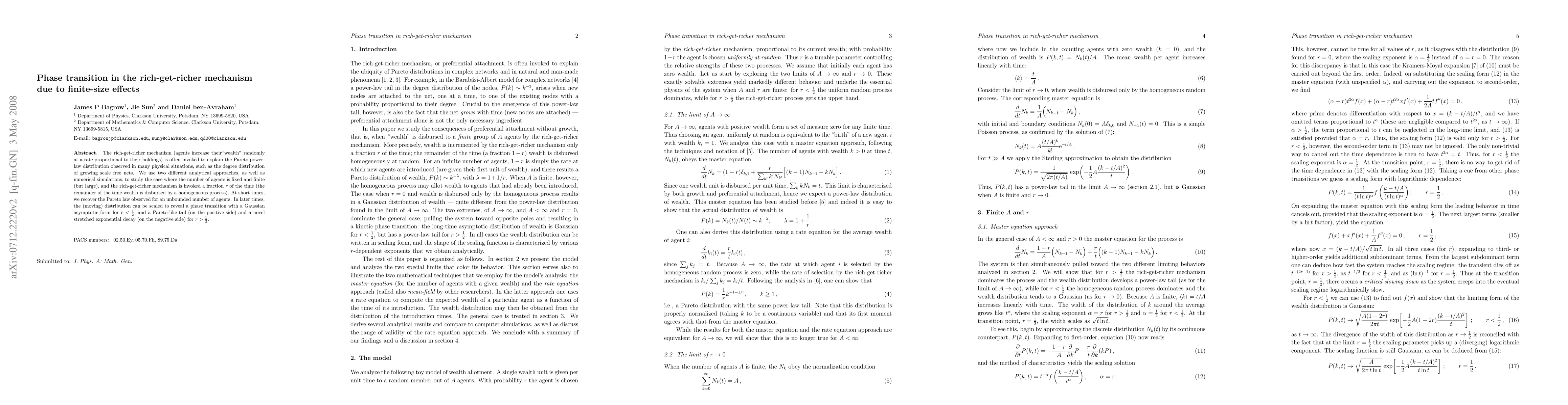 This paper investigates the rich-get-richer mechanism's phase transition under finite-size effects, revealing a Gaussian asymptotic form for less frequent rich-get-richer events and a mixed Pareto-stretched exponential decay for more frequent events. Analytical and numerical methods confirm these findings.