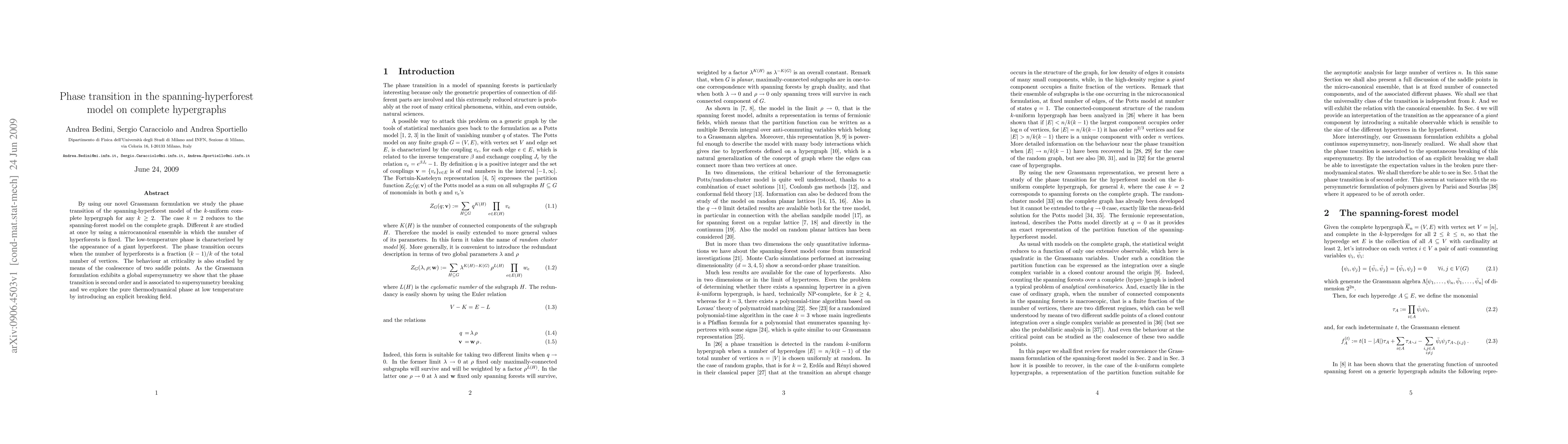 By using our novel Grassmann formulation we study the phase transition of the spanning-hyperforest model of the k-uniform complete hypergraph for any k>= 2. The case k=2 reduces to the spanning-forest model on the complete graph. Different k are studied at once by using a microcanonical ensemble in which the number of hyperforests is fixed. The low-temperature phase is characterized by the appearance of a giant hyperforest. The phase transition occurs when the number of hyperforests is a fraction (k-1)/k of the total number of vertices. The behaviour at criticality is also studied by means of the coalescence of two saddle points. As the Grassmann formulation exhibits a global supersymmetry we show that the phase transition is second order and is associated to supersymmetry breaking and we explore the pure thermodynamical phase at low temperature by introducing an explicit breaking field.