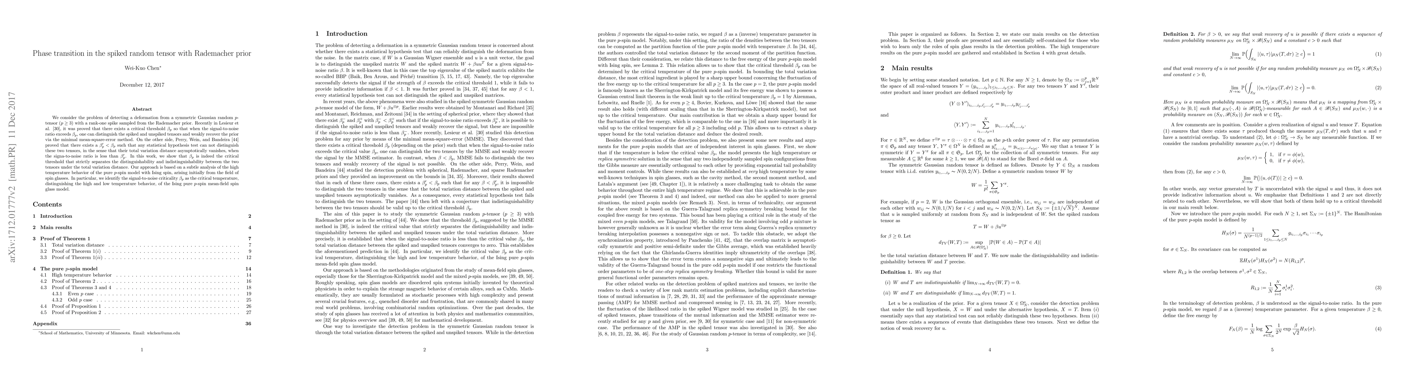 This research identifies a critical threshold u201cu1d61_pu201d for distinguishing between a deformed symmetric Gaussian random tensor with a rank-one spike from a non-deformed one, under Rademacher prior. The study uses the high-temperature behavior of the pure p-spin model with Ising spin, linking signal-to-noise criticality u201cu1d61_pu201d to the critical temperature in spin glasses, thus separating distinguishability and indistinguishability under total variation distance.