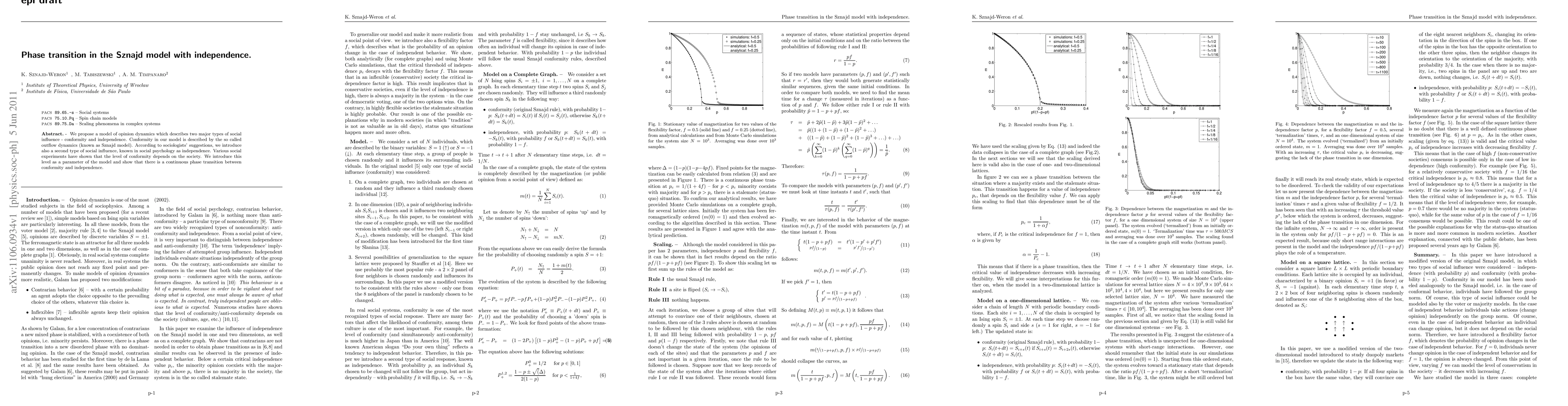 We propose a model of opinion dynamics which describes two major types of social influence -- conformity and independence. Conformity in our model is described by the so called outflow dynamics (known as Sznajd model). According to sociologists' suggestions, we introduce also a second type of social influence, known in social psychology as independence. Various social experiments have shown that the level of conformity depends on the society. We introduce this level as a parameter of the model and show that there is a continuous phase transition between conformity and independence.