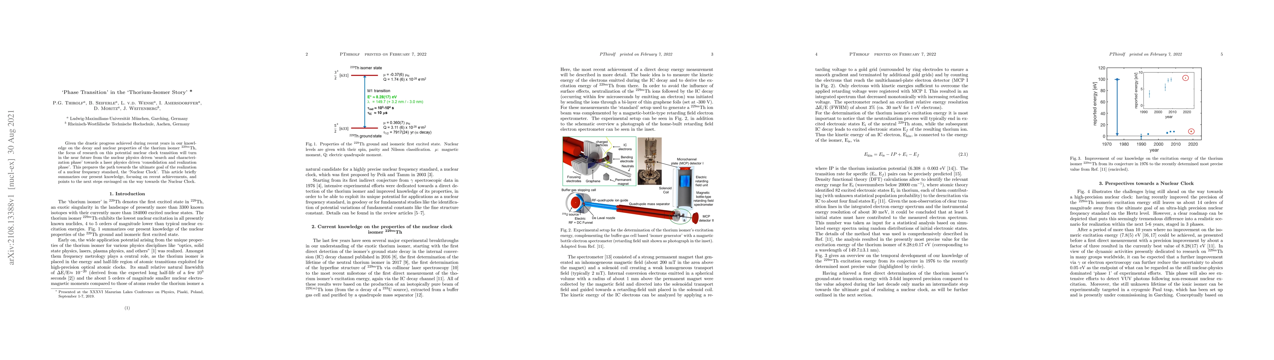 Given the drastic progress achieved during recent years in our knowledge on the decay and nuclear properties of the thorium isomer 229mTh, the focus of research on this potential nuclear clock transition will turn in the near future from the nuclear physics driven `search and characterization phase' towards a laser physics driven `consolidation and realization phase'. This prepares the path towards the ultimate goal of the realization of a nuclear frequency standard, the `Nuclear Clock'. This article briefly summarizes our present knowledge, focusing on recent achievements, and points to the next steps envisaged on the way towards the Nuclear Clock.