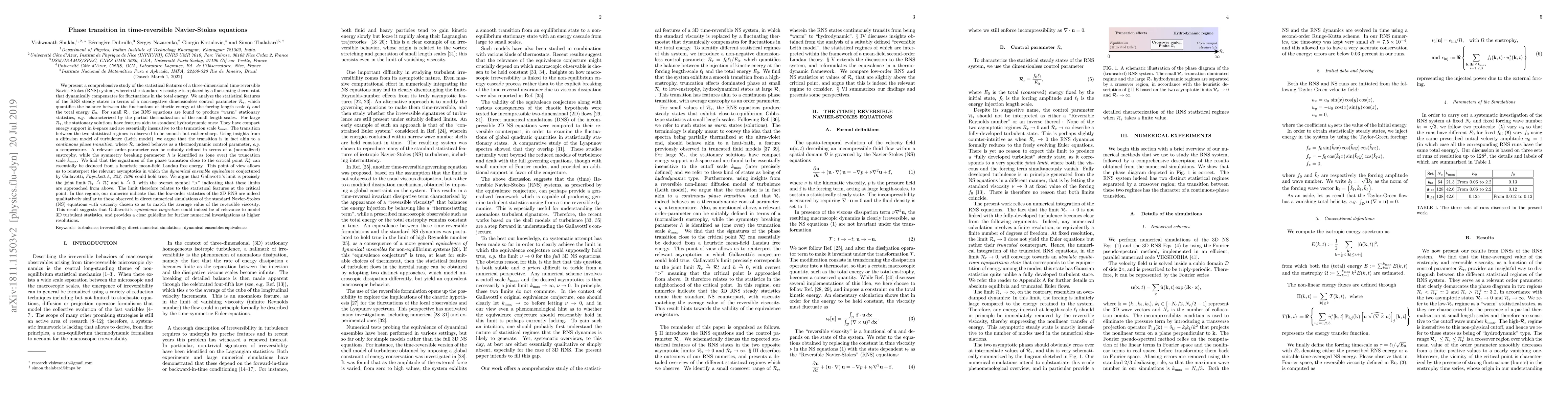 We present a comprehensive study of the statistical features of a three-dimensional time-reversible Navier-Stokes (RNS) system, wherein the standard viscosity $\nu$ is replaced by a fluctuating thermostat that dynamically compensates for fluctuations in the total energy. We analyze the statistical features of the RNS steady states in terms of a non-negative dimensionless control parameter $\mathcal{R}_r$, which quantifies the balance between the fluctuations of kinetic energy at the forcing length scale $\ell_{\rm f}$ and the total energy $E_0$. We find that the system exhibits a transition from a high-enstrophy phase at small $\mathcal{R}_r$, where truncation effects tend to produce partially thermalized states, to a hydrodynamical phase with low enstrophy at large $\mathcal{R}_r$. Using insights from a diffusion model of turbulence (Leith model), we argue that the transition is in fact akin to a continuous phase transition, where $\mathcal{R}_r$ indeed behaves as a thermodynamic control parameter, e.g., a temperature, the enstrophy plays the role of an order parameter, while the symmetry breaking parameter $h$ is (one over) the truncation scale $k_{\rm max}$. We find that the signatures of the phase transition close to the critical point $\mathcal{R}_r^\star$ can essentially be deduced from a heuristic mean-field Landau free energy. This point of view allows us to reinterpret the relevant asymptotics in which the dynamical ensemble equivalence conjectured by Gallavotti, Phys.Lett.A, 223, 1996 could hold true. Our numerics indicate that the low-order statistics of the 3D RNS are indeed qualitatively similar to those observed in direct numerical simulations of the standard Navier-Stokes (NS) equations with viscosity chosen so as to match the average value of the reversible viscosity.