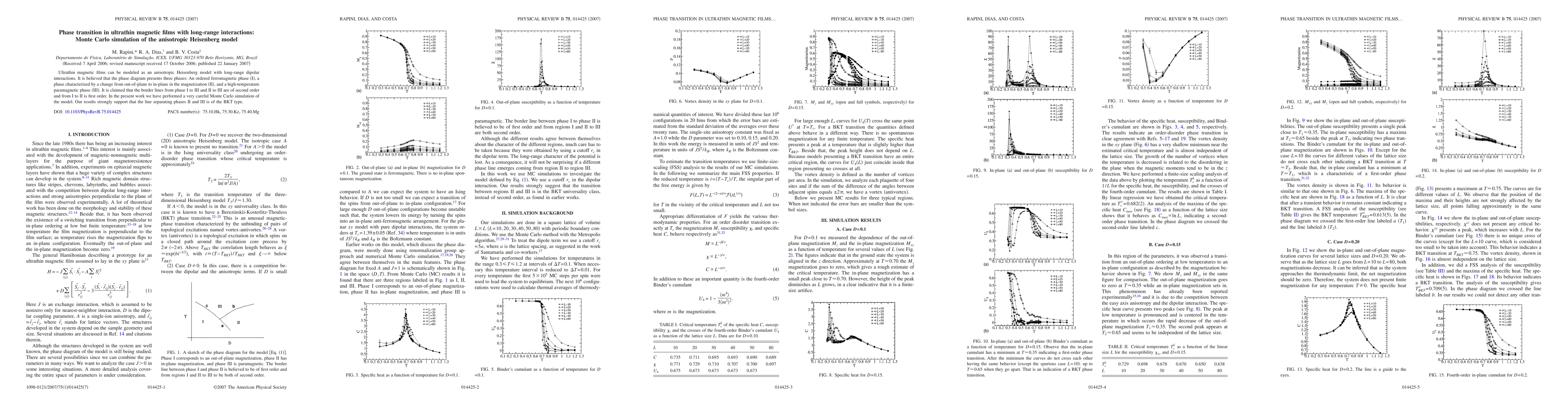This paper uses Monte Carlo simulations to study the anisotropic Heisenberg model of ultrathin magnetic films with long-range interactions, confirming that the transition between phases II and III is of the Berezinskii-Kosterlitz-Thouless (BKT) type, while other transitions are of different orders.