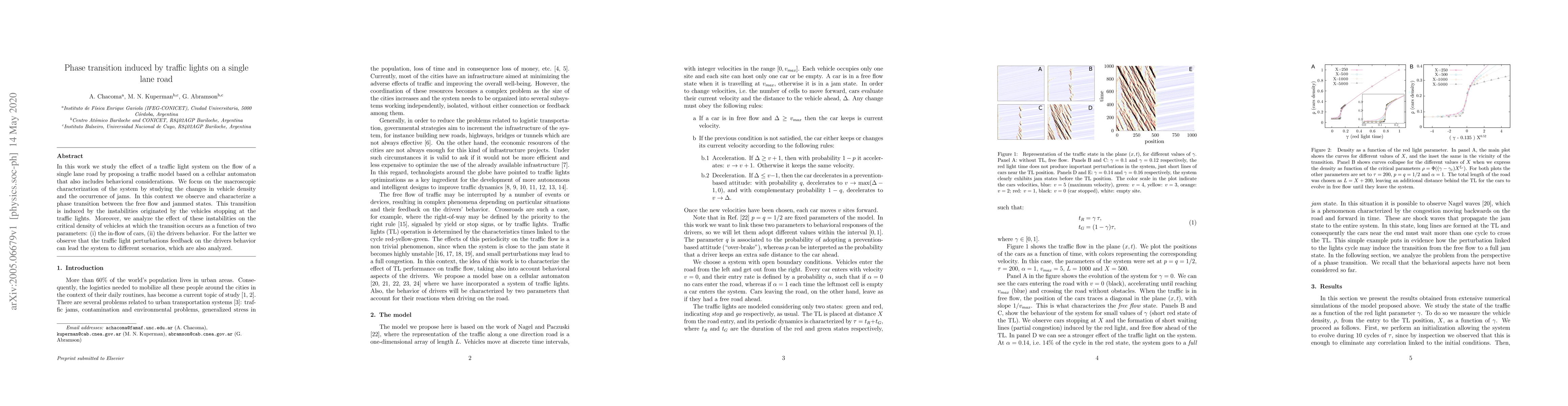 In this work we study the effect of a traffic light system on the flow of a single lane road by proposing a traffic model based on a cellular automaton that also includes behavioral considerations. We focus on the macroscopic characterization of the system by studying the changes in vehicle density and the occurrence of jams. In this context we observe and characterize a phase transition between the free flow and jammed states. This transition is induced by the instabilities originated by the vehicles stopping at the traffic lights. Moreover, we analyze the effect of these instabilities on the critical density of vehicles at which the transition occurs as a function of two parameters: (i) the in-flow of cars, (ii) the drivers' behavior. For the latter we observe that the traffic light perturbations feedback on the drivers behavior can lead the system to different scenarios, which are also analyzed.