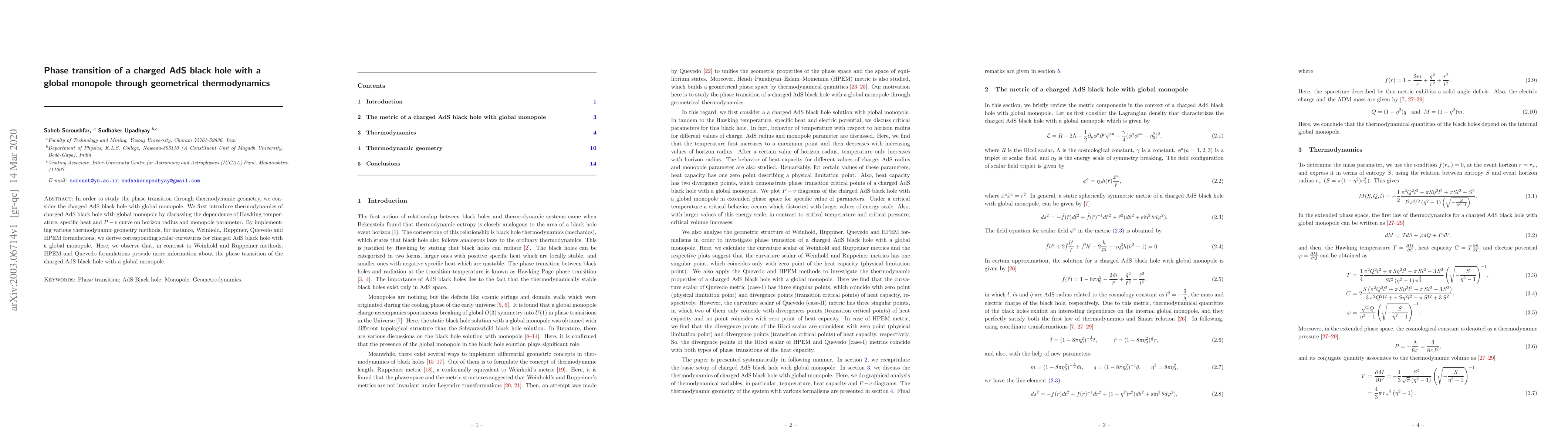 This paper investigates the phase transition of a charged AdS black hole with a global monopole using thermodynamic geometry methods. It finds that HPEM and Quevedo formulations offer more insights into the phase transition compared to Weinhold and Ruppeiner methods.