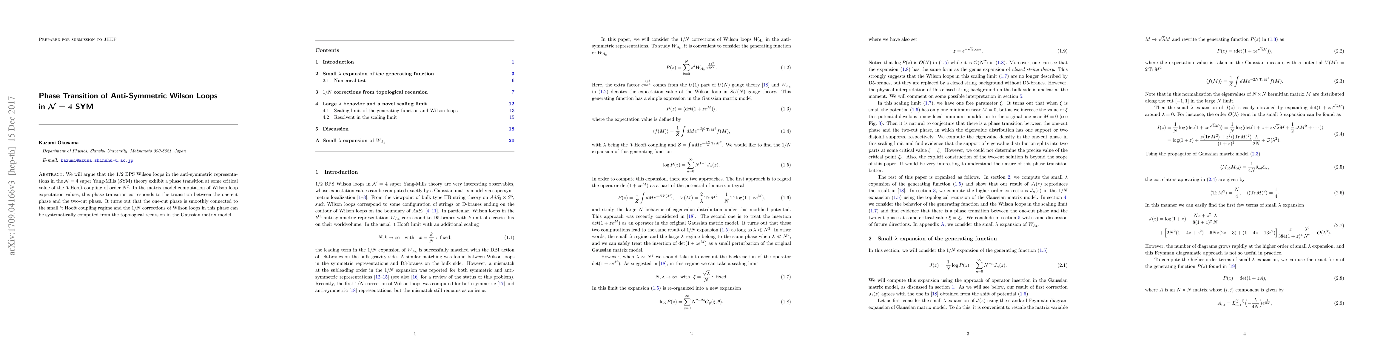 We will argue that the 1/2 BPS Wilson loops in the anti-symmetric representations in the $\mathcal{N}=4$ super Yang-Mills (SYM) theory exhibit a phase transition at some critical value of the 't Hooft coupling of order $N^2$. In the matrix model computation of Wilson loop expectation values, this phase transition corresponds to the transition between the one-cut phase and the two-cut phase. It turns out that the one-cut phase is smoothly connected to the small 't Hooft coupling regime and the $1/N$ corrections of Wilson loops in this phase can be systematically computed from the topological recursion in the Gaussian matrix model.