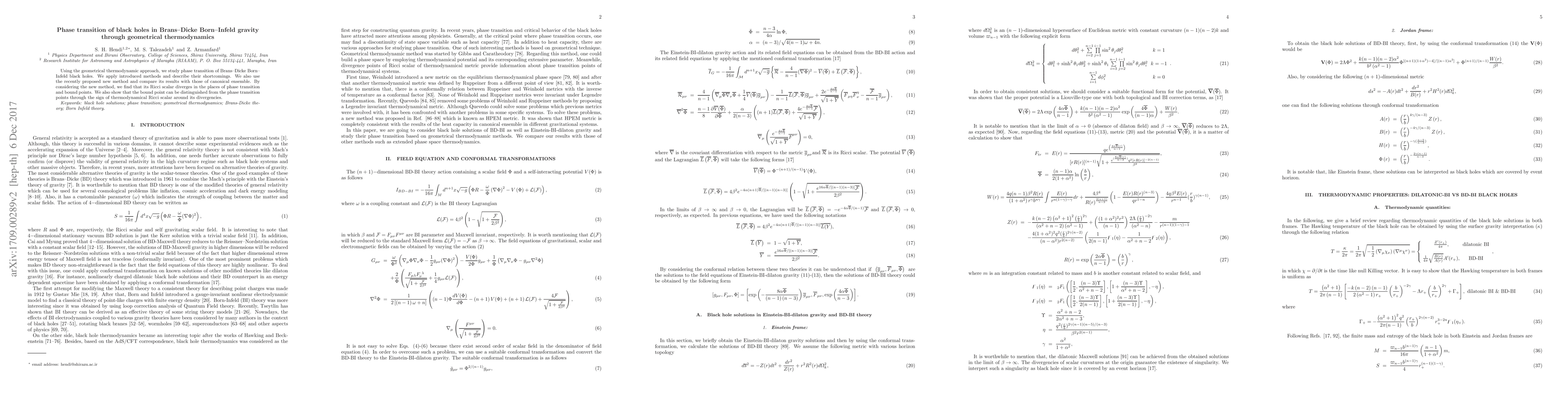 The research examines phase transitions in Brans-Dicke Born-Infeld black holes via geometrical thermodynamics, finding that the Ricci scalar diverges at phase transition and bound points, allowing distinction based on the sign of the thermodynamic Ricci scalar. Comparative analysis highlights shortcomings of introduced methods against a new proposed approach.
