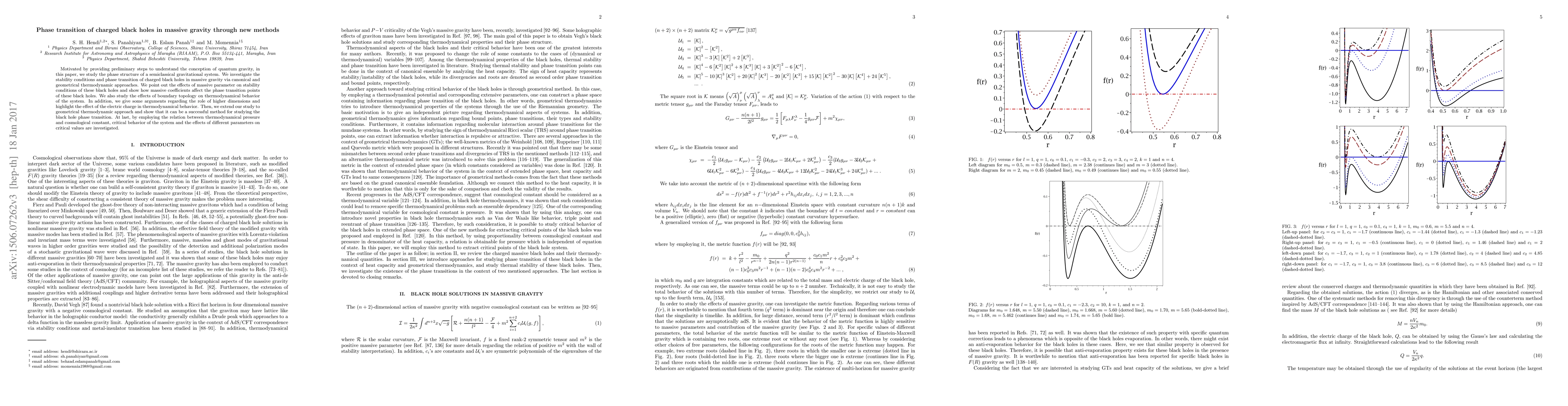 Motivated by providing preliminary steps to understand the conception of quantum gravity, in this paper, we study the phase structure of a semiclassical gravitational system. We investigate the stability conditions and phase transition of charged black holes in massive gravity via canonical and geometrical thermodynamic approaches. We point out the effects of massive parameter on stability conditions of these black holes and show how massive coefficients affect the phase transition points of these black holes. We also study the effects of boundary topology on thermodynamical behavior of the system. In addition, we give some arguments regarding the role of higher dimensions and highlight the effect of the electric charge in thermodynamical behavior. Then, we extend our study to geometrical thermodynamic approach and show that it can be a successful method for studying the black hole phase transition. At last, by employing the relation between thermodynamical pressure and cosmological constant, critical behavior of the system and the effects of different parameters on critical values are investigated.