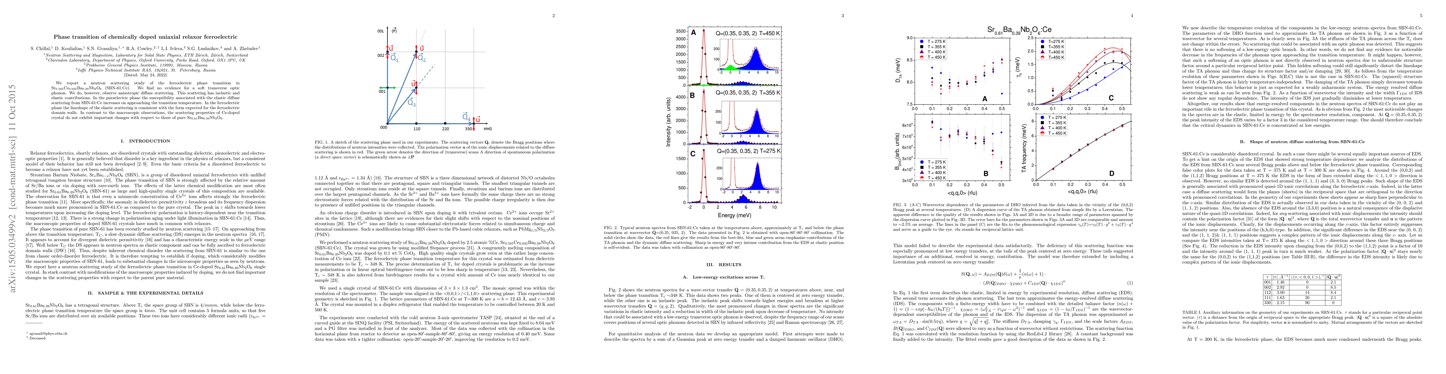 We report a neutron scattering study of the ferroelectric phase transition in Sr$_{0.585}$Ce$_{0.025}$Ba$_{0.39}$Nb$_2$O$_6$ (SBN-61:Ce). We find no evidence for a soft transverse optic phonon. We do, however, observe anisotropic diffuse scattering. This scattering has inelastic and elastic contributions. In the paraelectric phase the susceptibility associated with the elastic diffuse scattering follows well the anomaly of the dielectric susceptibility of SBN-61:Ce. In the ferroelectric phase the lineshape of the elastic scattering is consistent with the form expected for the ferroelectric domain walls. In contrast to the macroscopic observations, the scattering properties of Ce-doped crystal do not exhibit important changes with respect to those of pure Sr$_{0.61}$Ba$_{0.39}$Nb$_2$O$_6$.