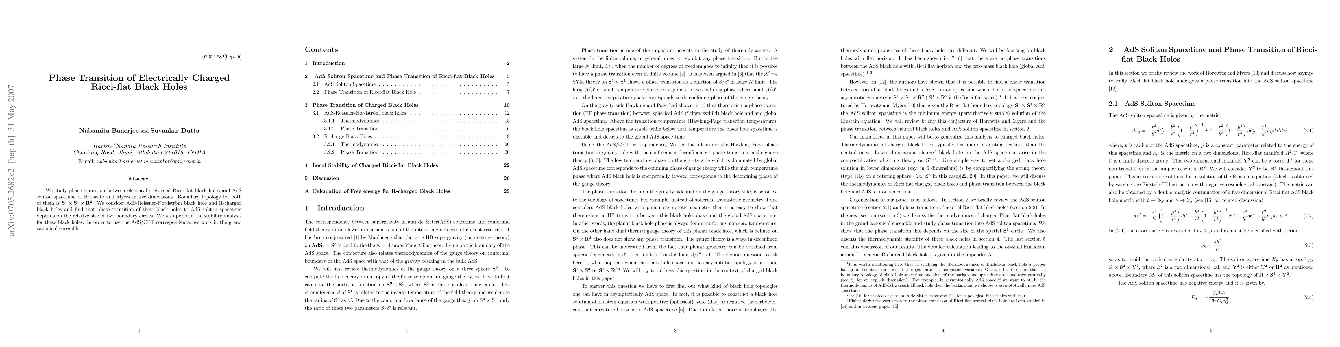 This paper investigates the phase transition between electrically charged Ricci-flat black holes and AdS soliton spacetimes in five dimensions, focusing on Reissner-Nordstrom and R-charged black holes. The study reveals that the transition depends on the relative size of boundary circles and includes a stability analysis, conducted within the grand canonical ensemble to utilize the AdS/CFT correspondence.
