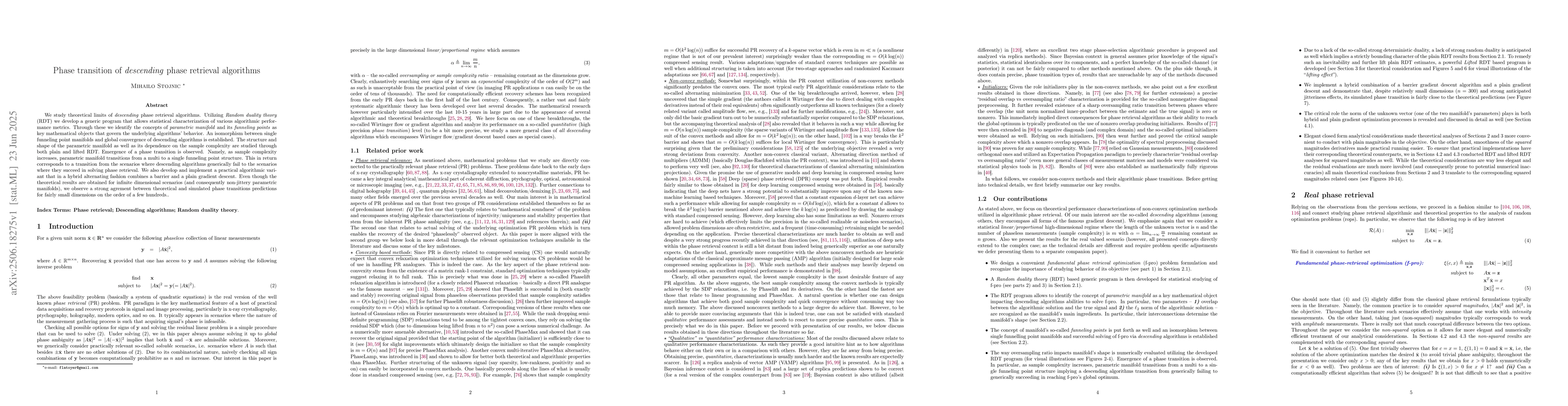 This research uses Random duality theory to analyze descending phase retrieval algorithms, identifying key mathematical objects like parametric manifolds and funneling points. A phase transition is observed as sample complexity increases, marking a shift from algorithmic failure to success. Theoretical findings align with simulations for dimensions around a few hundred.
