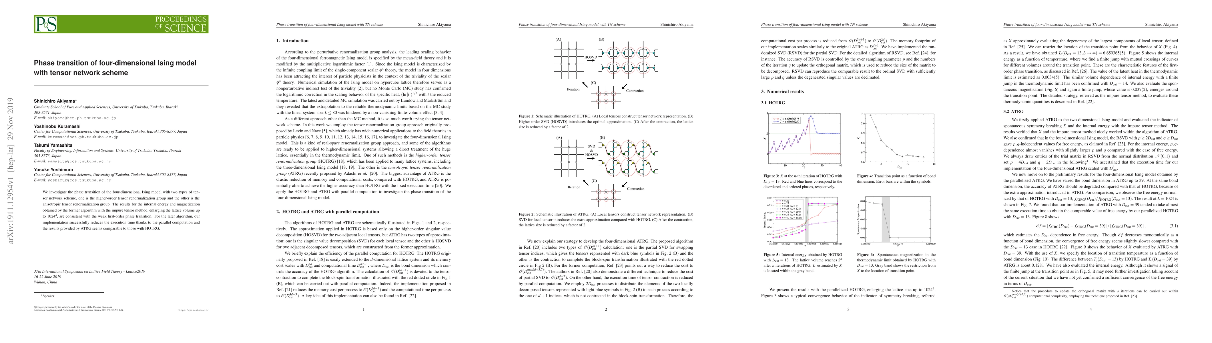 This study explores the phase transition in the four-dimensional Ising model using two tensor network schemes: higher-order tensor renormalization group (HOTRG) and anisotropic tensor renormalization group (ATRG). The HOTRG results align with a weak first-order phase transition, while ATRG effectively reduces computation time through parallel processing and provides comparable results.