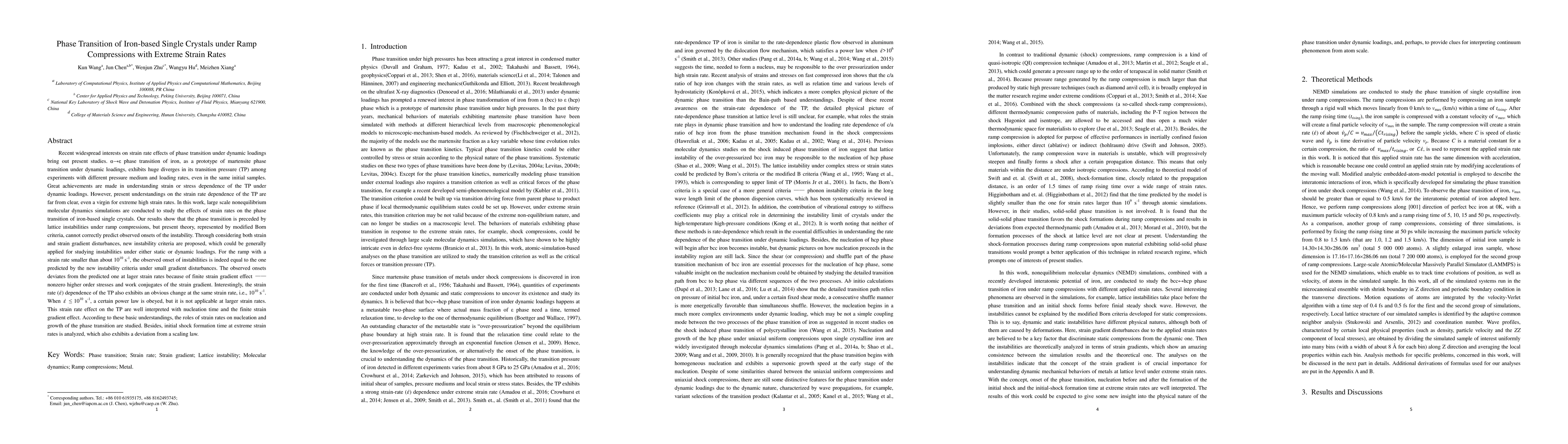 This study uses large-scale NEMD simulations to investigate the strain rate dependence of martensite phase transition in iron-based single crystals under dynamic loadings. The research reveals that lattice instabilities precede phase transitions and proposes new instability criteria considering both strain and strain gradient effects, which better predict phase transition onsets under small gradient disturbances.