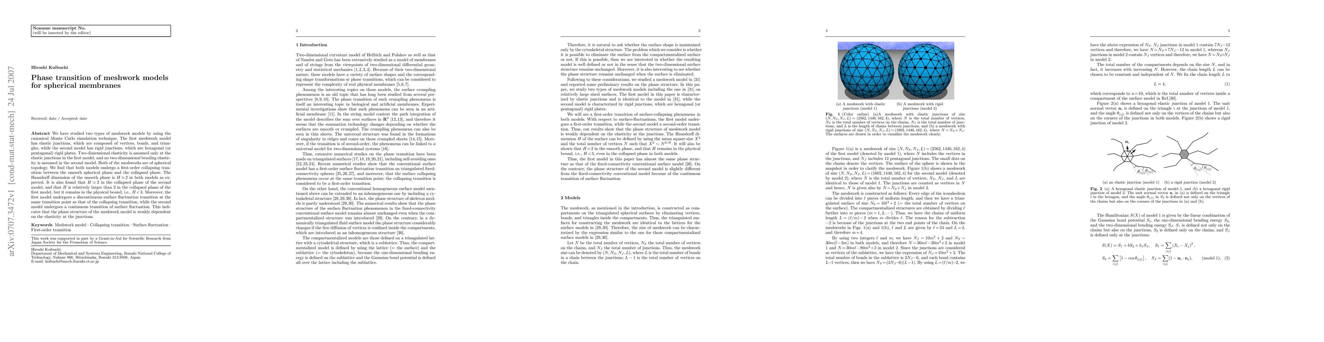 We have studied two types of meshwork models by using the canonical Monte Carlo simulation technique. The first meshwork model has elastic junctions, which are composed of vertices, bonds, and triangles, while the second model has rigid junctions, which are hexagonal (or pentagonal) rigid plates. Two-dimensional elasticity is assumed only at the elastic junctions in the first model, and no two-dimensional bending elasticity is assumed in the second model. Both of the meshworks are of spherical topology. We find that both models undergo a first-order collapsing transition between the smooth spherical phase and the collapsed phase. The Hausdorff dimension of the smooth phase is H\simeq 2 in both models as expected. It is also found that H\simeq 2 in the collapsed phase of the second model, and that H is relatively larger than 2 in the collapsed phase of the first model, but it remains in the physical bound, i.e., H<3. Moreover, the first model undergoes a discontinuous surface fluctuation transition at the same transition point as that of the collapsing transition, while the second model undergoes a continuous transition of surface fluctuation. This indicates that the phase structure of the meshwork model is weakly dependent on the elasticity at the junctions.