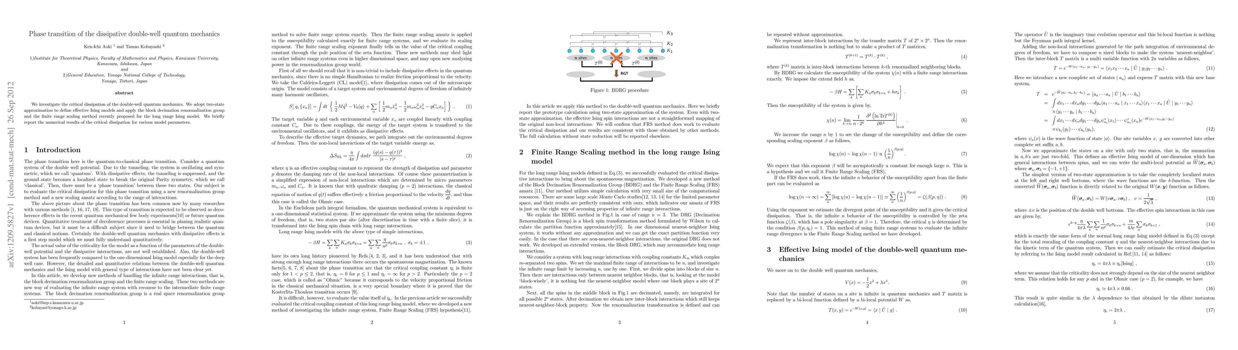 We investigate the critical dissipation of the double-well quantum mechanics. We adopt two-state approximation to define effective Ising models and apply the block decimation renormalization group and the finite range scaling method recently proposed for the long range Ising model. We briefly report the numerical results of the critical dissipation for various model parameters.