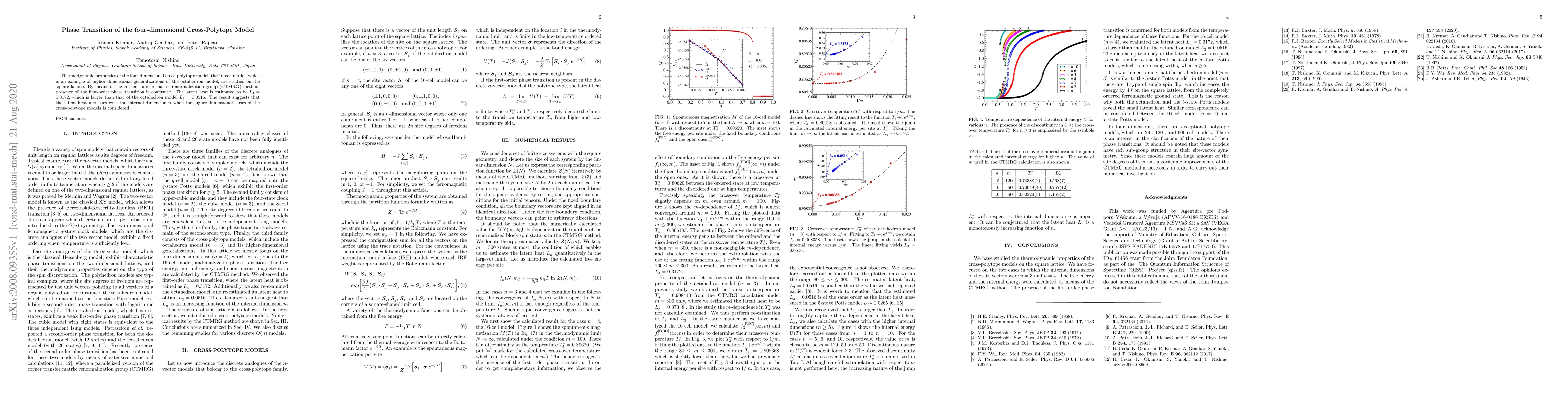 The four-dimensional cross-polytope model exhibits a first-order phase transition with a latent heat of 0.3172, higher than the octahedron model, suggesting an increase in latent heat with internal dimension.