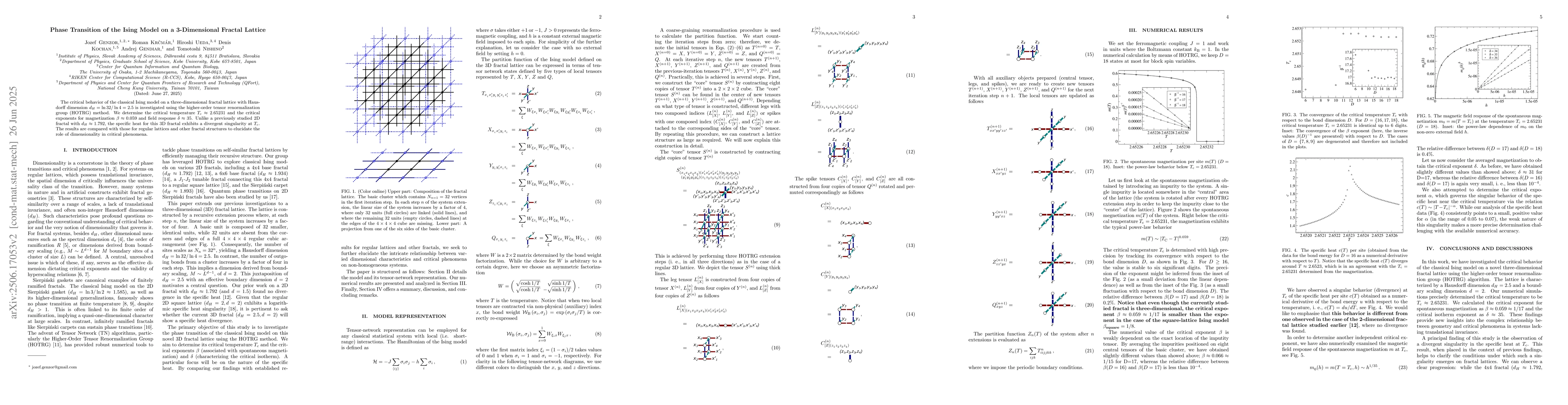 The critical behavior of the classical Ising model on a three-dimensional fractal lattice with Hausdorff dimension $d_H = \ln32 / \ln4 = 2.5$ is investigated using the higher-order tensor renormalization group (HOTRG) method. We determine the critical temperature $T_c \approx 2.65231$ and the critical exponents for magnetization $\beta \approx 0.059$ and field response $\delta \approx 35$. Unlike a previously studied 2D fractal with $d_H \approx 1.792$, the specific heat for this 3D fractal exhibits a divergent singularity at $T_c$. The results are compared with those for regular lattices and other fractal structures to elucidate the role of dimensionality in critical phenomena.